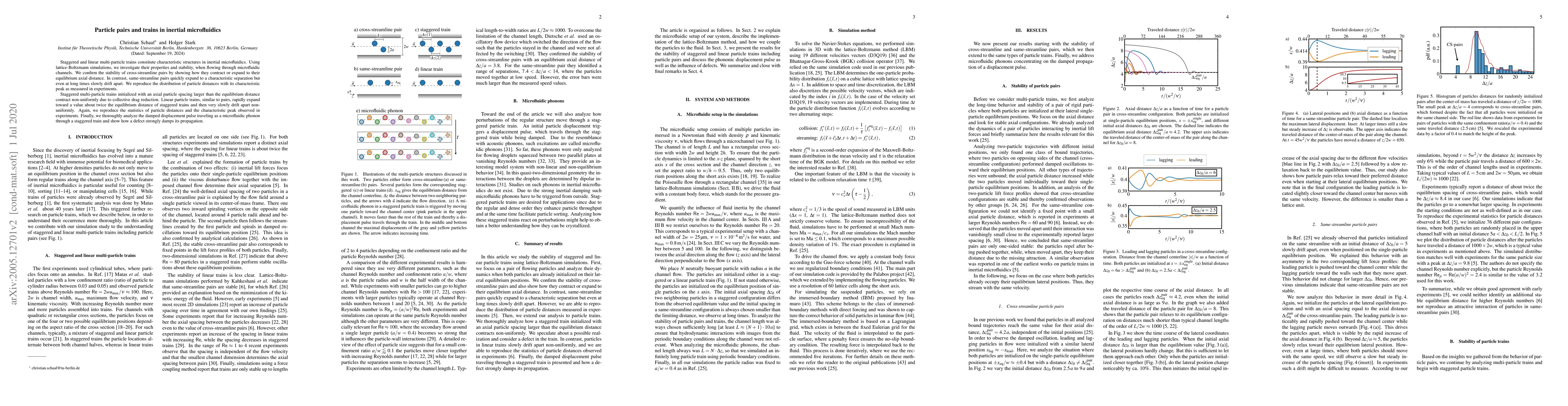 This study uses lattice-Boltzmann simulations to explore the stability and behavior of particle pairs and trains in inertial microfluidics, confirming the stability of cross-streamline pairs and the expansion dynamics of same-streamline pairs, while also analyzing the contraction and expansion of staggered and linear multi-particle trains. The simulations reproduce experimental observations of particle distance distributions and the propagation of microfluidic phonons.