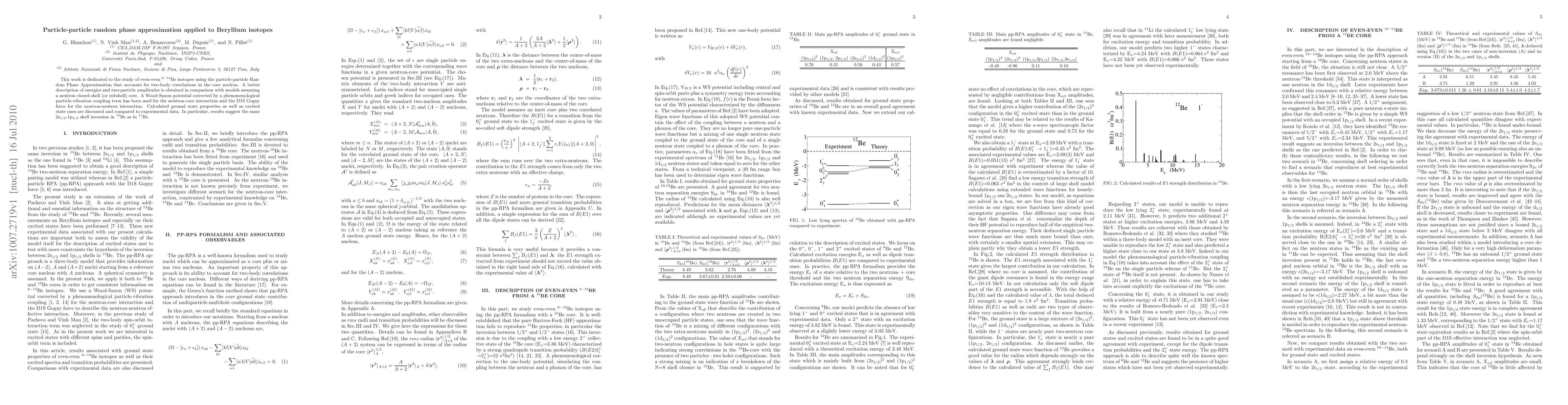 This study applies the particle-particle Random Phase Approximation to analyze 8-14 Be isotopes, revealing improved descriptions of energies and two-particle amplitudes. The model, using a Wood-Saxon potential and D1S Gogny force, suggests a 2s_1/2-1p_1/2 shell inversion in 13Be similar to 11Be, compared to experimental data.