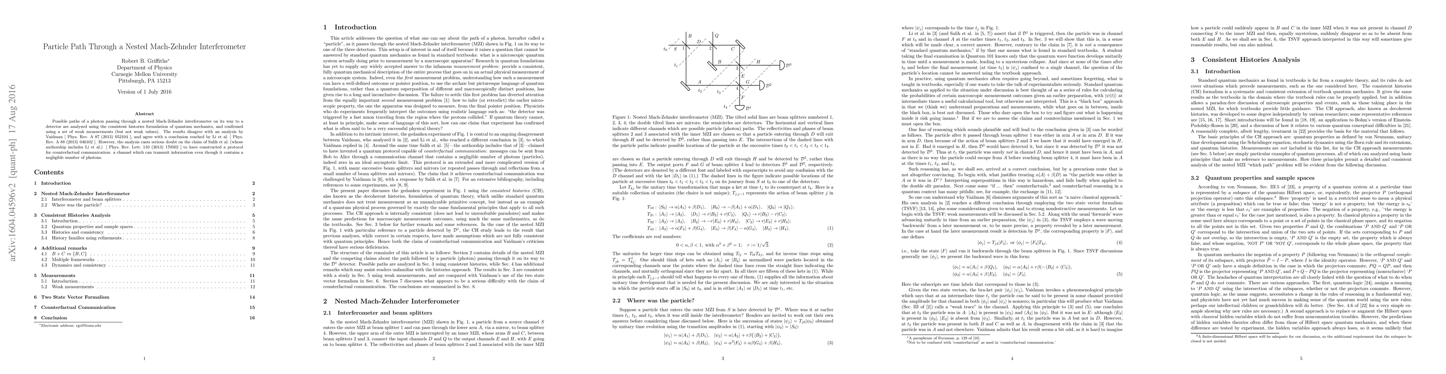 Possible paths of a photon passing through a nested Mach-Zehnder interferometer on its way to a detector are analyzed using the consistent histories formulation of quantum mechanics, and confirmed using a set of weak measurements (but not weak values). The results disagree with an analysis by Vaidman [ Phys.\ Rev.\ A 87 (2013) 052104 ], and agree with a conclusion reached by Li et al.\ [ Phys.\ Rev.\ A 88 (2013) 046102 ]. However, the analysis casts serious doubt on the claim of Salih et al.\ (whose authorship includes Li et al.) [ Phys.\ Rev.\ Lett.\ 110 (2013) 170502 ] to have constructed a protocol for counterfactual communication: a channel which can transmit information even though it contains a negligible number of photons.