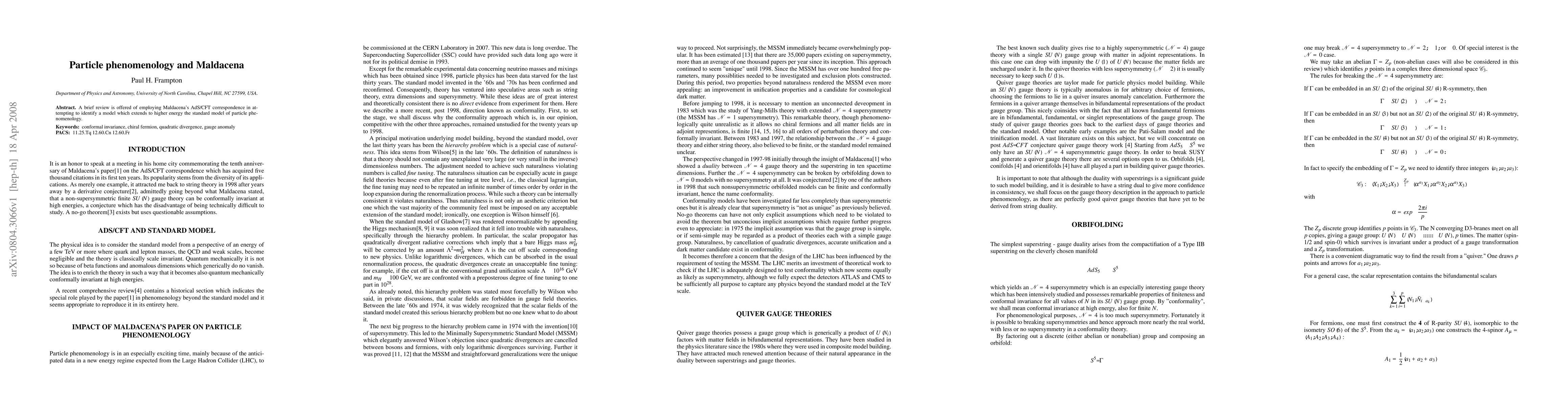 A brief review is offered of employing Maldacena's AdS/CFT correspondence in attempting to identify a model which extends to higher energy the standard model of particle phenomenology.