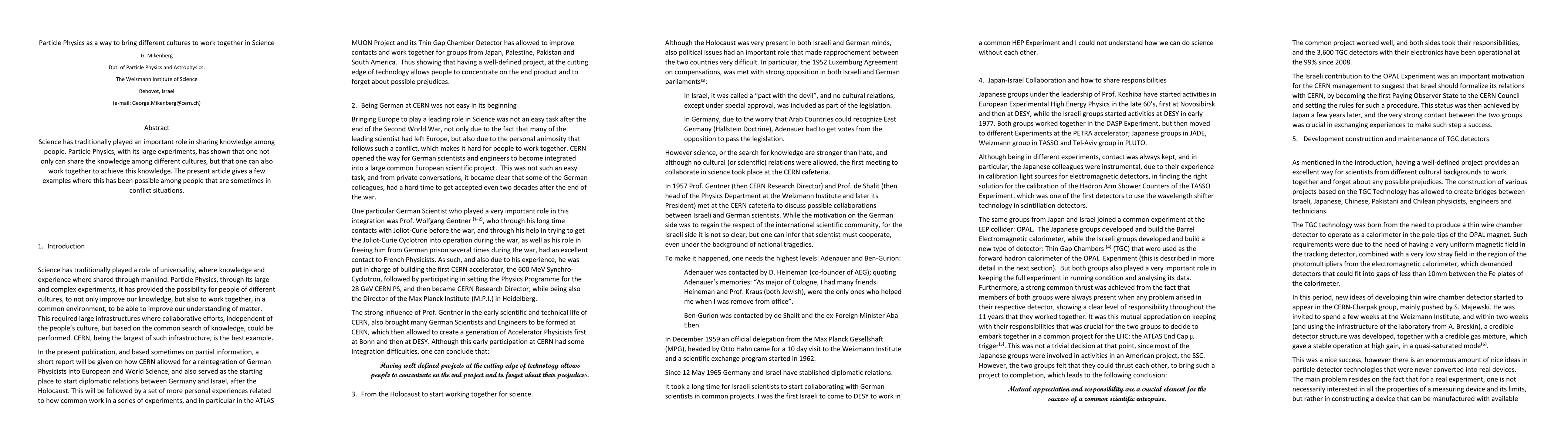 Science has traditionally played an important role in sharing knowledge among people. Particle Physics, with its large experiments, has shown that one not only can share the knowledge among different cultures, but that one can also work together to achieve this knowledge. The present article gives a few examples where this has been possible among people that are sometimes in conflict situations.