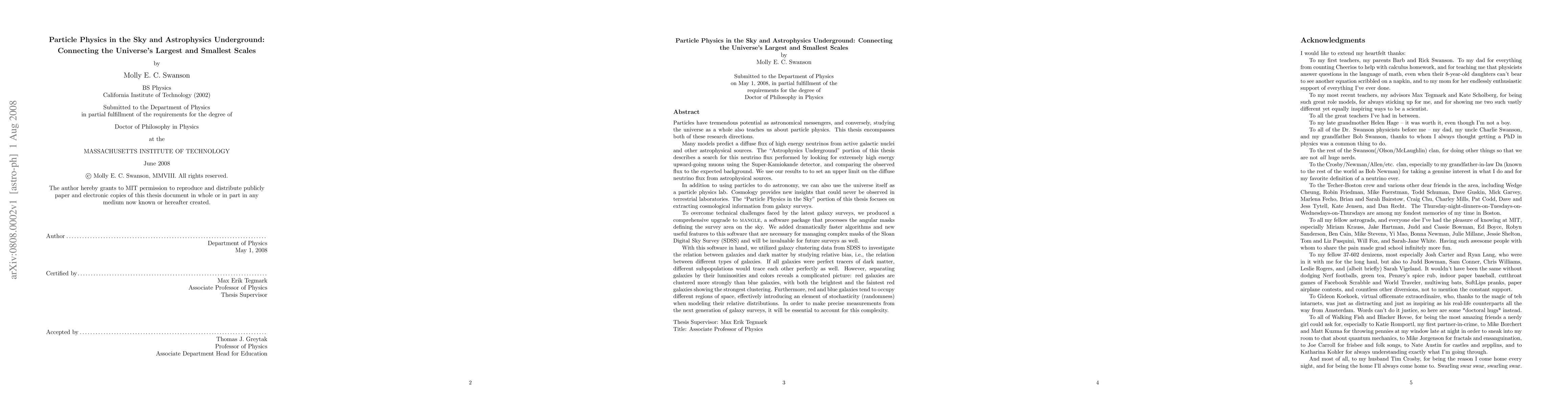 Particles have tremendous potential as astronomical messengers, and conversely, studying the universe as a whole also teaches us about particle physics. This thesis encompasses both of these research directions. Many models predict a diffuse flux of high energy neutrinos from active galactic nuclei and other astrophysical sources. The "Astrophysics Underground" portion of this thesis describes a search for this neutrino flux performed by looking for very high energy upward-going muons using the Super-K detector. In addition to using particles to do astronomy, we can also use the universe itself as a particle physics lab. The "Particle Physics in the Sky" portion of this thesis focuses on extracting cosmological information from galaxy surveys. To overcome technical challenges faced by the latest galaxy surveys, we produced a comprehensive upgrade to mangle, a software package that processes the angular masks defining the survey area on the sky. We added dramatically faster algorithms and new useful features that are necessary for managing complex masks of current and next-generation galaxy surveys. With this software in hand, we utilized SDSS data to investigate the relation between galaxies and dark matter by studying relative bias, i.e., the relation between different types of galaxies. Separating galaxies by their luminosities and colors reveals a complicated picture: red galaxies are clustered more strongly than blue galaxies, with both the brightest and the faintest red galaxies showing the strongest clustering. Furthermore, red and blue galaxies tend to occupy different regions of space. In order to make precise measurements from the next generation of galaxy surveys, it will be essential to account for this complexity.
