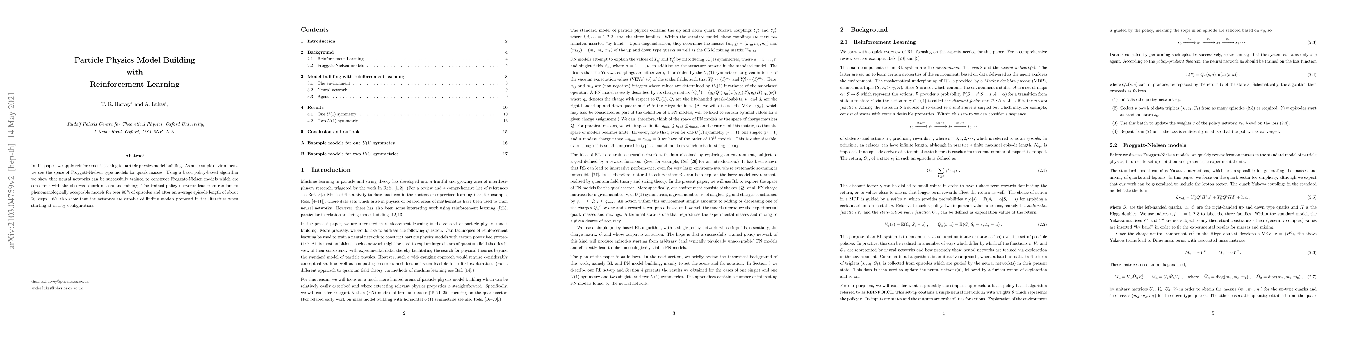 Researchers successfully trained neural networks to build particle physics models using reinforcement learning, achieving 90% phenomenological accuracy in just 20 steps. The networks were able to find proposed models when starting from nearby configurations.