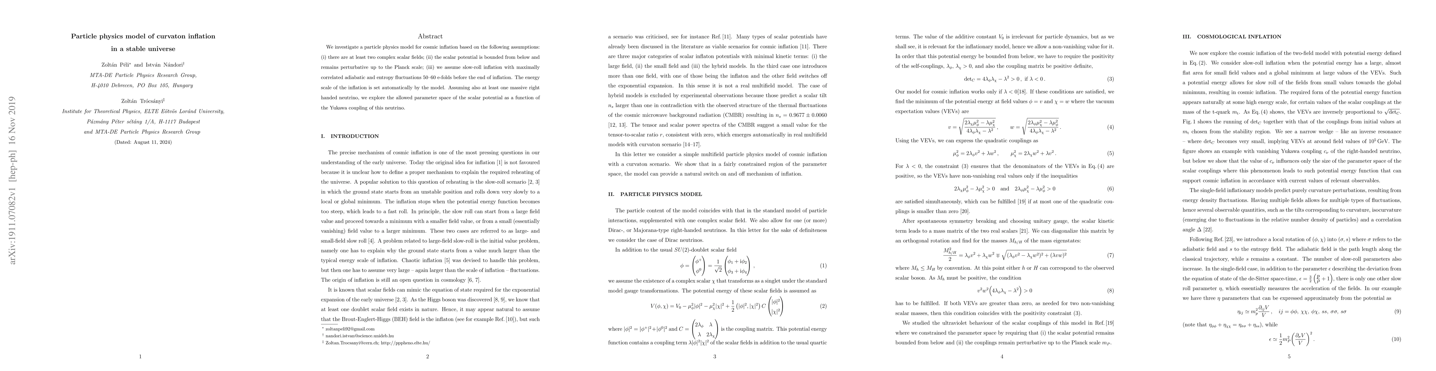 We investigate a particle physics model for cosmic inflation based on the following assumptions: (i) there are at least two complex scalar fields; (ii) the scalar potential is bounded from below and remains perturbative up to the Planck scale; (iii) we assume slow-roll inflation with maximally correlated adiabatic and entropy fluctuations 50--60 e-folds before the end of inflation. The energy scale of the inflation is set automatically by the model. Assuming also at least one massive right handed neutrino, we explore the allowed parameter space of the scalar potential as a function of the Yukawa coupling of this neutrino.