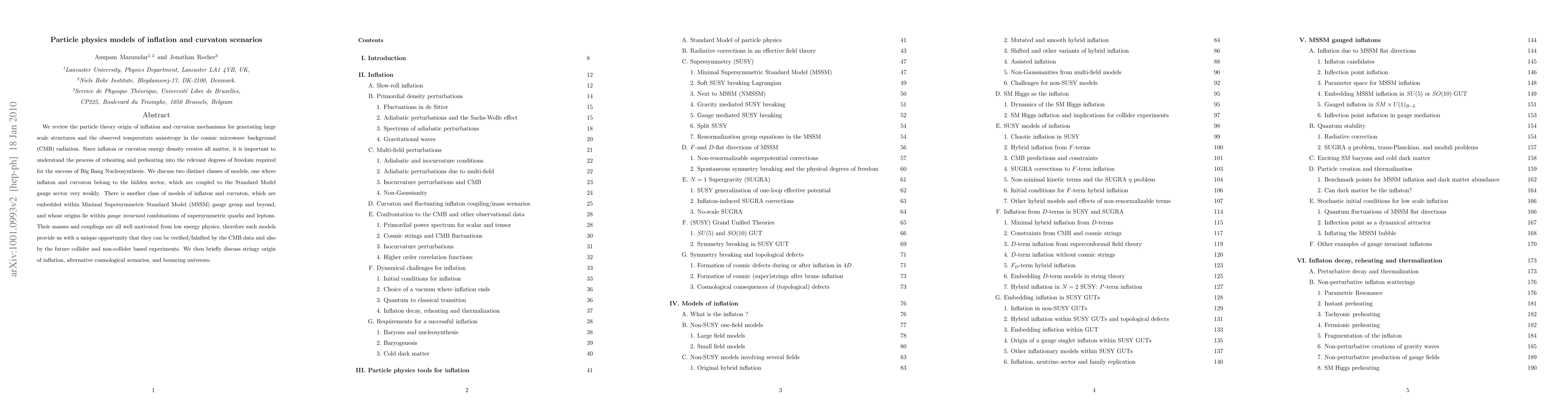 This paper reviews particle physics models of inflation and curvaton mechanisms, focusing on their roles in generating large-scale structures and cosmic microwave background temperature anisotropies. It examines two classes of models: one where inflaton and curvaton belong to a hidden sector and another where they are part of the Minimal Supersymmetric Standard Model, emphasizing their potential verification through CMB and future experiments.