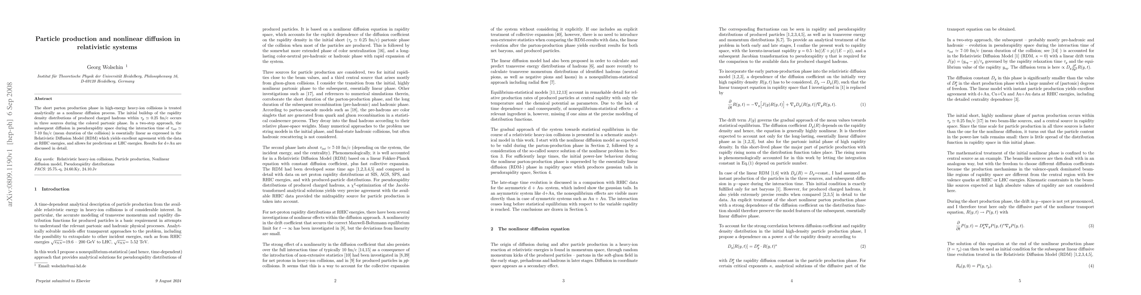 The short parton production phase in high-energy heavy-ion collisions is treated analytically as a nonlinear diffusion process. The initial buildup of the rapidity density distributions of produced charged hadrons within tau_p = 0.25 fm/c occurs in three sources during the colored partonic phase. In a two-step approach, the subsequent diffusion in pseudorapidity space during the interaction time of tau_int = 7-10 fm/c (mean duration of the collision) is essentially linear as expressed in the Relativistic Diffusion Model (RDM) which yields excellent agreement with the data at RHIC energies, and allows for predictions at LHC energies. Results for d+Au are discussed in detail.
