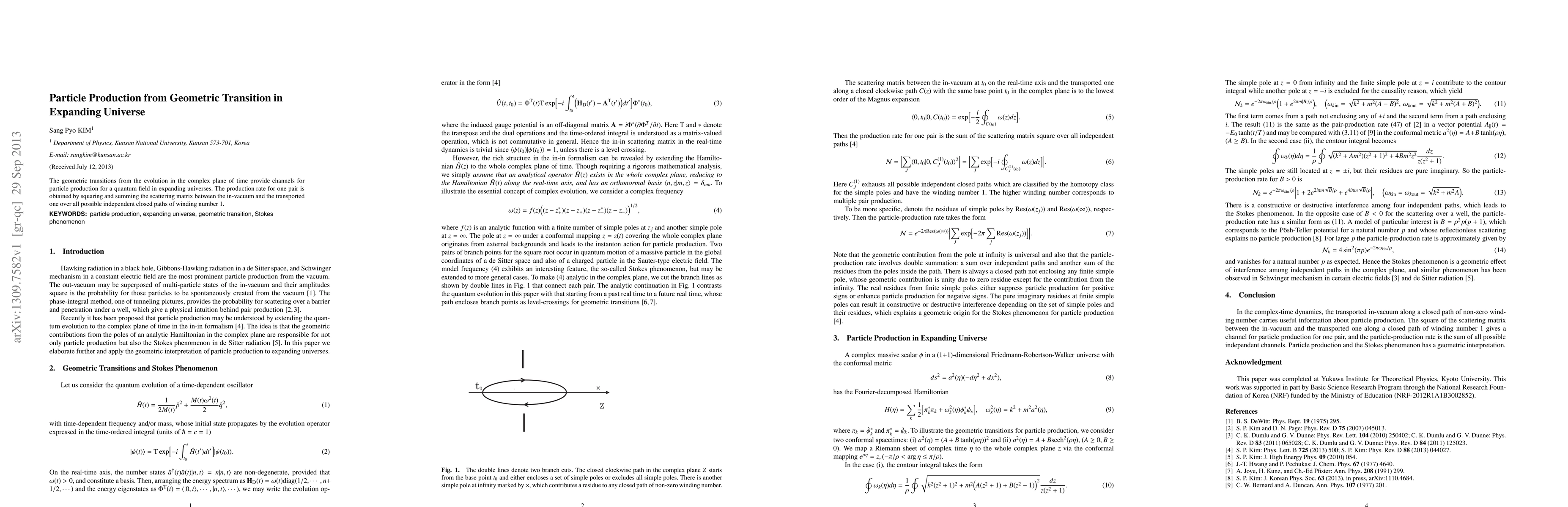 The geometric transitions from the evolution in the complex plane of time provide channels for particle production for a quantum field in expanding universes. The production rate for one pair is obtained by squaring and summing the scattering matrix between the in-vacuum and the transported one over all possible independent closed paths of winding number 1.