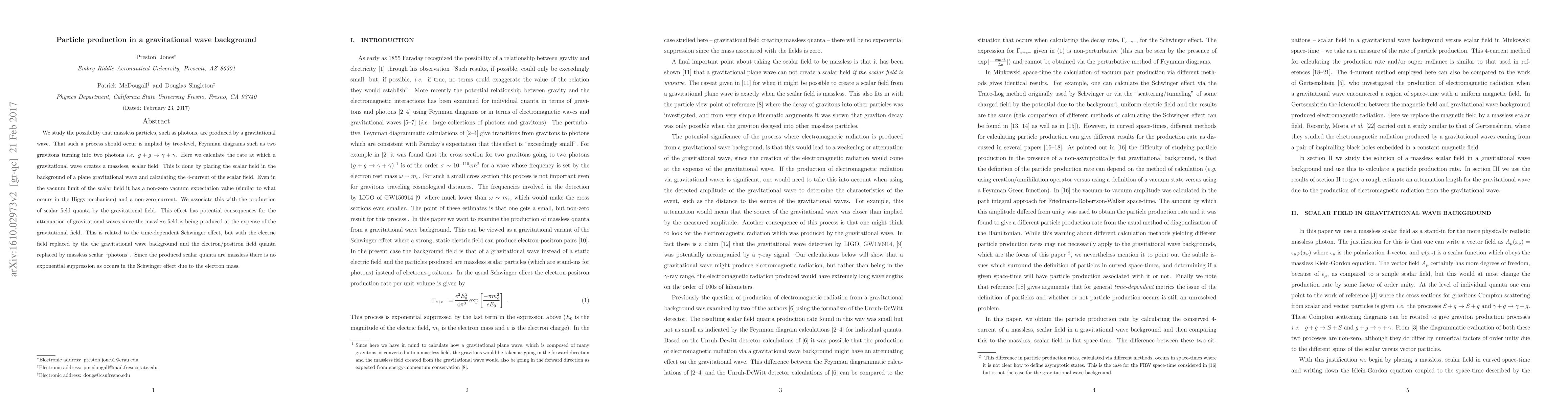 We study the possibility that massless particles, such as photons, are produced by a gravitational wave. That such a process should occur is implied by tree-level, Feynman diagrams such as two gravitons turning into two photons i.e. $g + g \rightarrow \gamma + \gamma$. Here we calculate the rate at which a gravitational wave creates a massless, scalar field. This is done by placing the scalar field in the background of a plane gravitational wave and calculating the 4-current of the scalar field. Even in the vacuum limit of the scalar field it has a non-zero vacuum expectation value (similar to what occurs in the Higgs mechanism) and a non-zero current. We associate this with the production of scalar field quanta by the gravitational field. This effect has potential consequences for the attenuation of gravitational waves since the massless field is being produced at the expense of the gravitational field. This is related to the time-dependent Schwinger effect, but with the electric field replaced by the the gravitational wave background and the electron/positron field quanta replaced by massless scalar "photons". Since the produced scalar quanta are massless there is no exponential suppression as occurs in the Schwinger effect due to the electron mass.