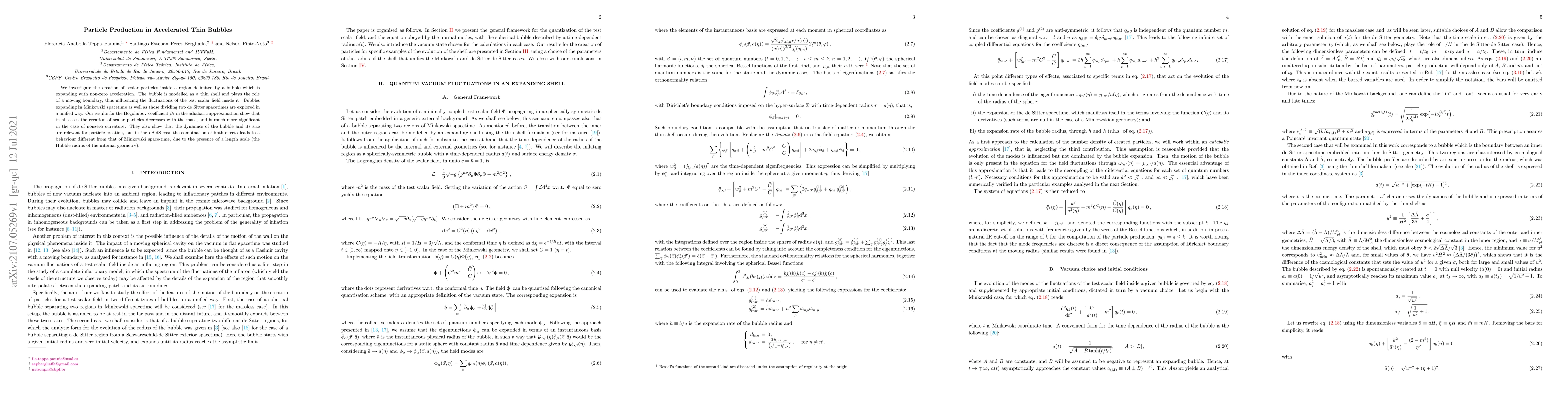 We investigate the creation of scalar particles inside a region delimited by a bubble which is expanding with non-zero acceleration. The bubble is modelled as a thin shell and plays the role of a moving boundary, thus influencing the fluctuations of the test scalar field inside it. Bubbles expanding in Minkowski spacetime as well as those dividing two de Sitter spacetimes are explored in a unified way. Our results for the Bogoliubov coefficient $\beta_k$ in the adiabatic approximation show that in all cases the creation of scalar particles decreases with the mass, and is much more significant in the case of nonzero curvature. They also show that the dynamics of the bubble and its size are relevant for particle creation, but in the dS-dS case the combination of both effects leads to a behaviour different from that of Minkowski space-time, due to the presence of a length scale (the Hubble radius of the internal geometry).