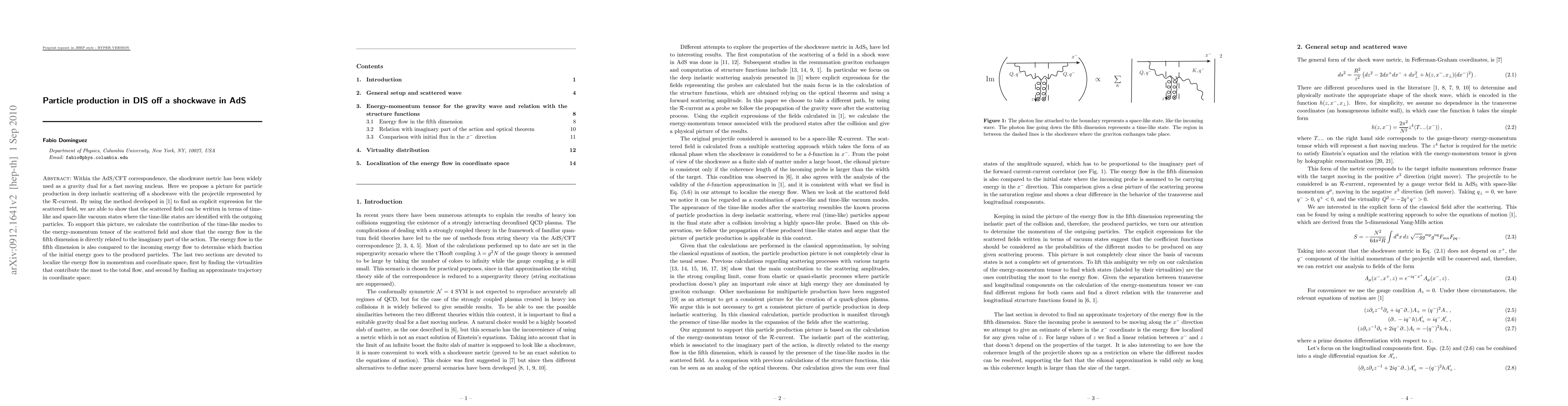 This paper explores particle production in deep inelastic scattering (DIS) using the AdS/CFT correspondence, where a shockwave metric represents a fast-moving nucleus. It demonstrates that the scattered field can be expressed in terms of time-like and space-like vacuum states, identifying time-like states with outgoing particles, and calculates the energy flow in the fifth dimension to determine the fraction of initial energy converted into particle production.