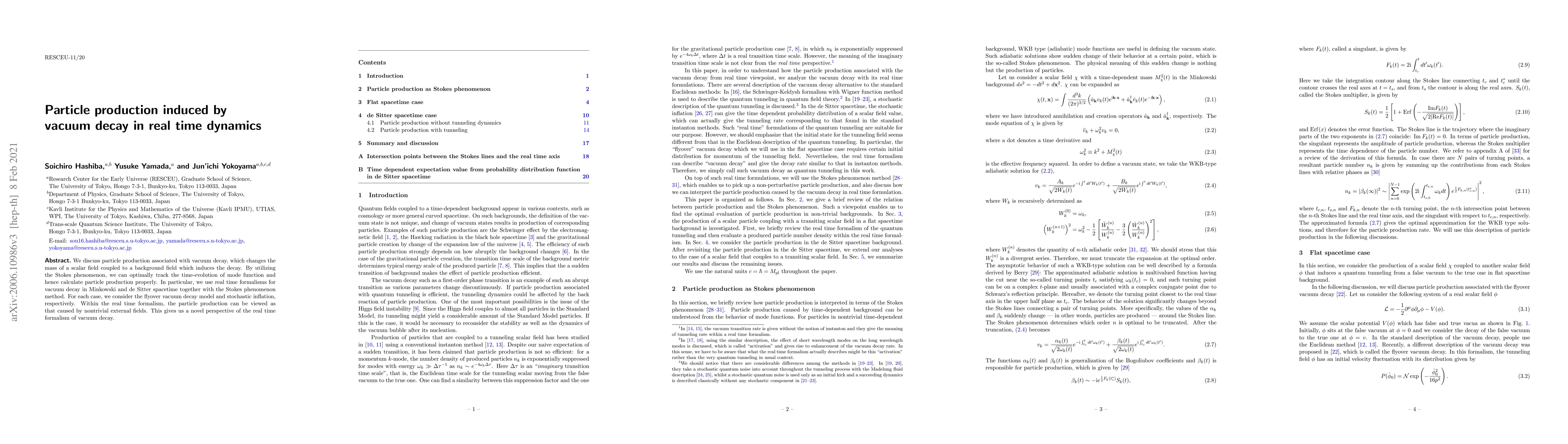 This paper investigates particle production during vacuum decay using real time dynamics, employing the Stokes phenomenon to track mode function evolution. It applies real time formalisms in Minkowski and de Sitter spacetimes, analyzing the flyover decay model and stochastic inflation, and provides a novel perspective on vacuum decay through nontrivial external fields.