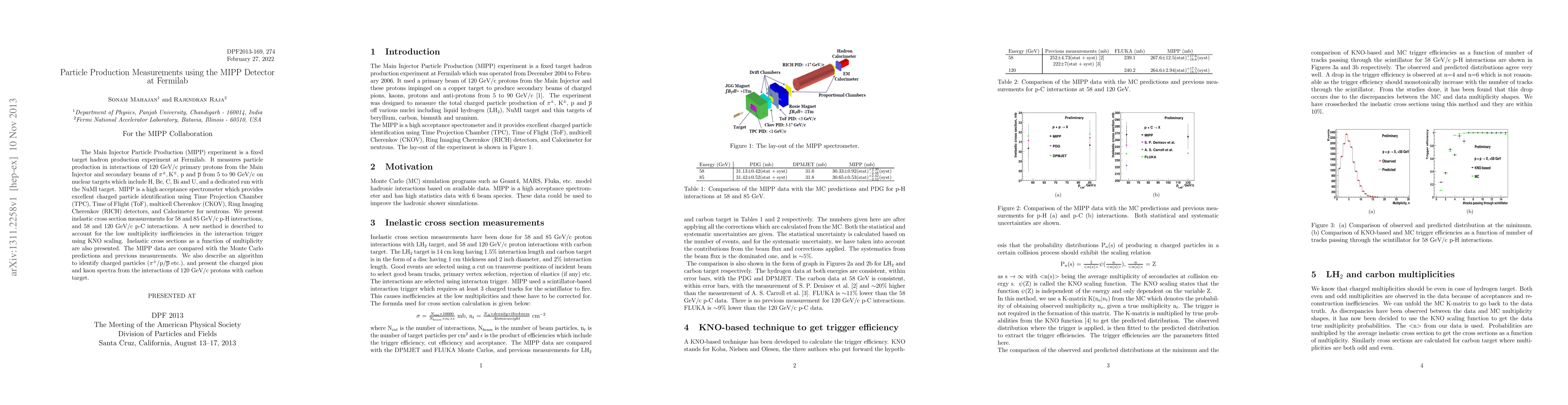The Main Injector Particle Production (MIPP) experiment is a fixed target hadron production experiment at Fermilab. It measures particle production in interactions of 120 GeV/c primary protons from the Main Injector and secondary beams of $\pi^{\pm}, \rm{K}^{\pm}$, p and $\bar{\rm{p}}$ from 5 to 90 GeV/c on nuclear targets which include H, Be, C, Bi and U, and a dedicated run with the NuMI target. MIPP is a high acceptance spectrometer which provides excellent charged particle identification using Time Projection Chamber (TPC), Time of Flight (ToF), multicell Cherenkov (CKOV), Ring Imaging Cherenkov (RICH) detectors, and Calorimeter for neutrons. We present inelastic cross section measurements for 58 and 85 GeV/c p-H interactions, and 58 and 120 GeV/c p-C interactions. A new method is described to account for the low multiplicity inefficiencies in the interaction trigger using KNO scaling. Inelastic cross sections as a function of multiplicity are also presented. The MIPP data are compared with the Monte Carlo predictions and previous measurements. We also describe an algorithm to identify charged particles ($\pi^{\pm}/\rm{p}/\bar{\rm{p}}$ etc.), and present the charged pion and kaon spectra from the interactions of 120 GeV/c protons with carbon target.