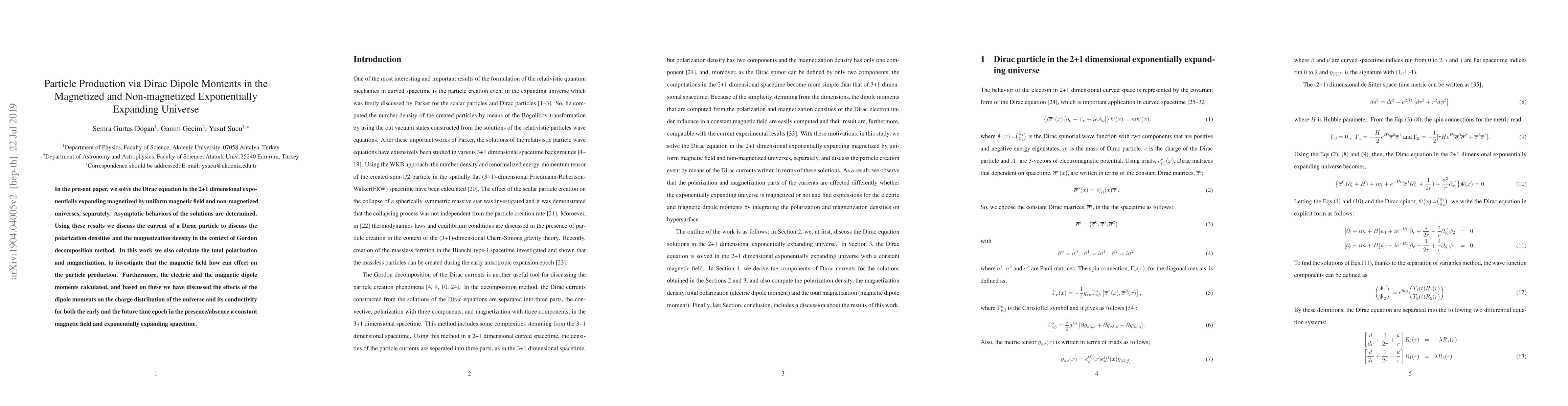 This research paper investigates particle production in magnetized and non-magnetized universes with exponentially expanding spacetime, focusing on the effects of Dirac dipole moments and magnetic fields on particle currents and polarization densities.