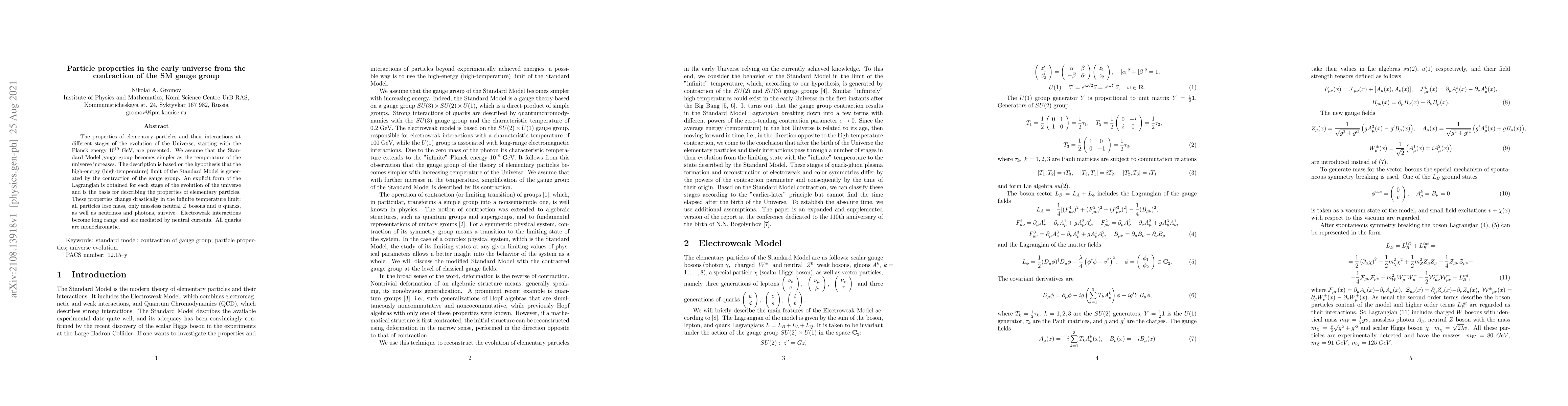 The properties of elementary particles and their interactions at different stages of the evolution of the Universe, starting with the Planck energy $ 10 ^{19} $ GeV, are presented. We assume that the Standard Model gauge group becomes simpler as the temperature of the universe increases. The description is based on the hypothesis that the high-energy (high-temperature) limit of the Standard Model is generated by the contraction of the gauge group. An explicit form of the Lagrangian is obtained for each stage of the evolution of the universe and is the basis for describing the properties of elementary particles. These properties change drastically in the infinite temperature limit: all particles lose mass, only massless neutral $ Z $ bosons and $ u $ quarks, as well as neutrinos and photons, survive. Electroweak interactions become long range and are mediated by neutral currents. All quarks are monochromatic.