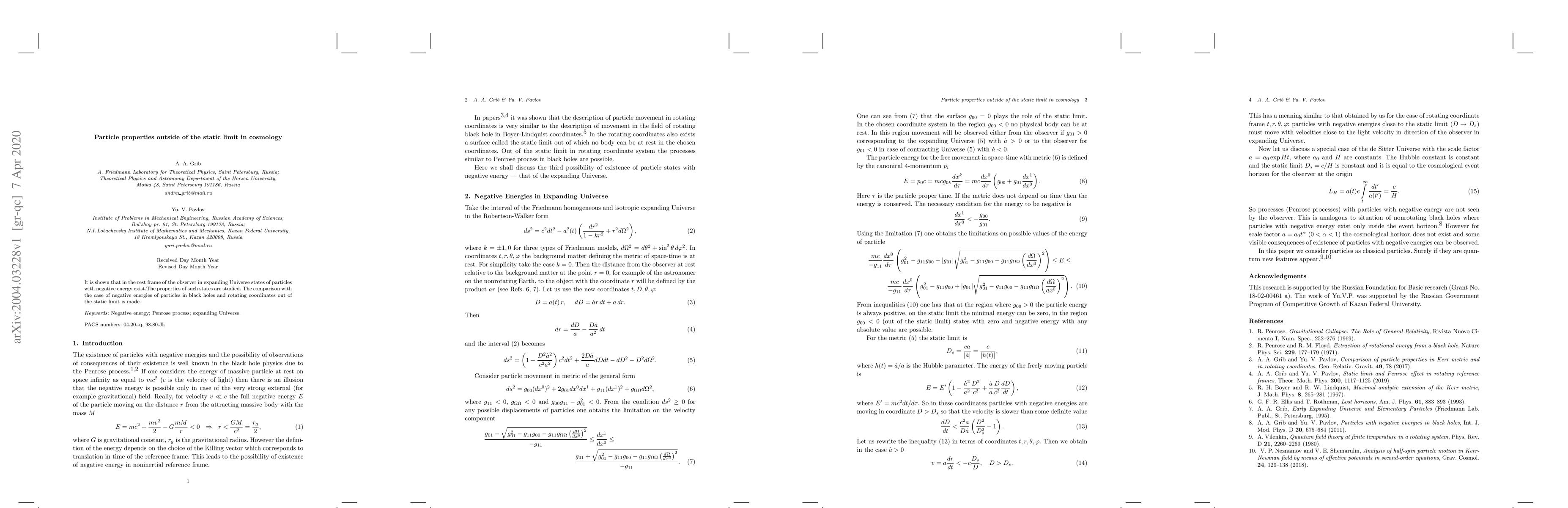 Research shows that in an expanding universe, particles with negative energy exist outside of a static limit. These particles have unique properties similar to those found in black holes and rotating coordinates.