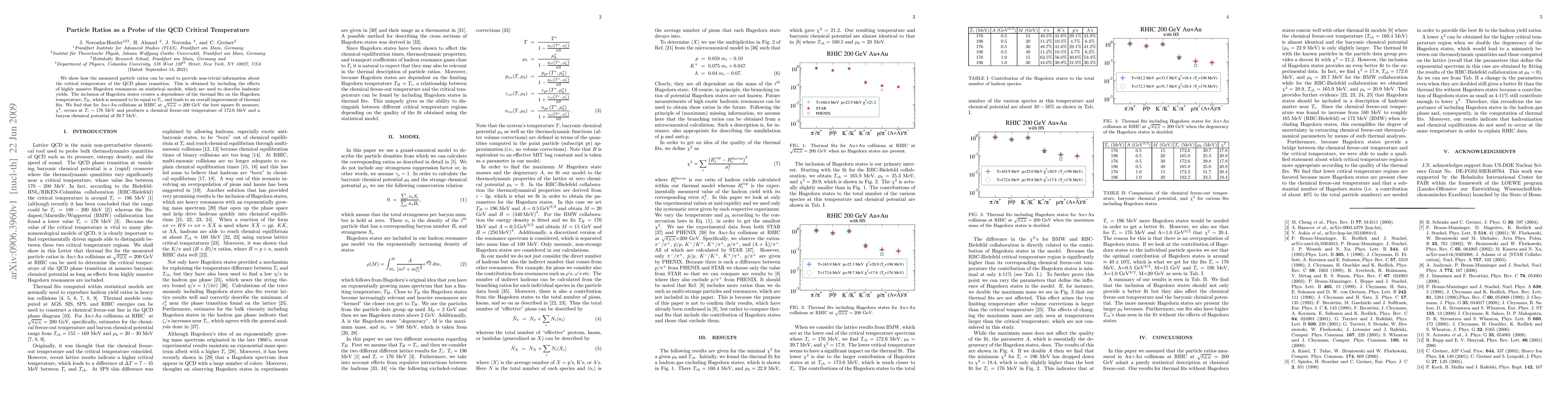 We show how the measured particle ratios can be used to provide non-trivial information about the critical temperature of the QCD phase transition. This is obtained by including the effects of highly massive Hagedorn resonances on statistical models, which are used to describe hadronic yields. The inclusion of Hagedorn states creates a dependence of the thermal fits on the Hagedorn temperature, $T_H$, which is assumed to be equal to $T_c$, and leads to an overall improvement of thermal fits. We find that for Au+Au collisions at RHIC at $\sqrt{s_{NN}}=200$ GeV the best square fit measure, $\chi^2$, occurs at $T_c \sim 176$ MeV and produces a chemical freeze-out temperature of 172.6 MeV and a baryon chemical potential of 39.7 MeV.