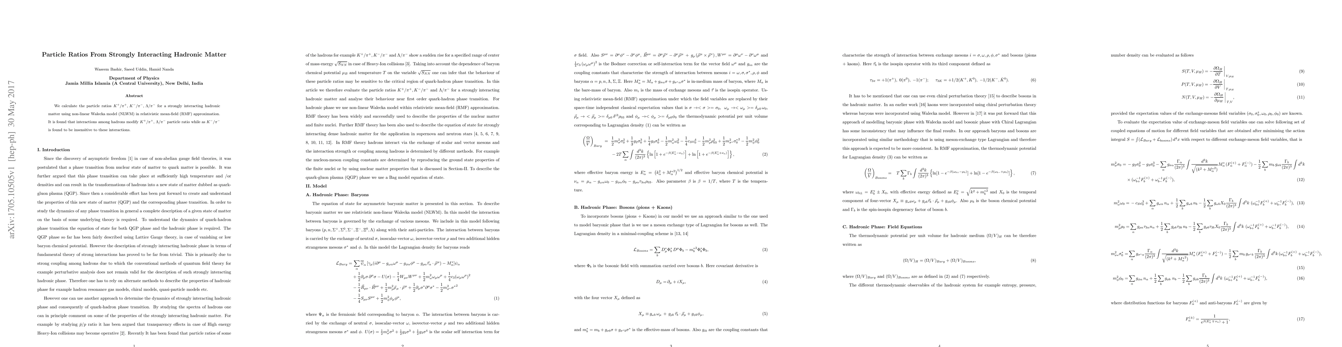 Researchers used a non-linear model to calculate particle ratios in strongly interacting hadronic matter, comparing their findings with another approach.