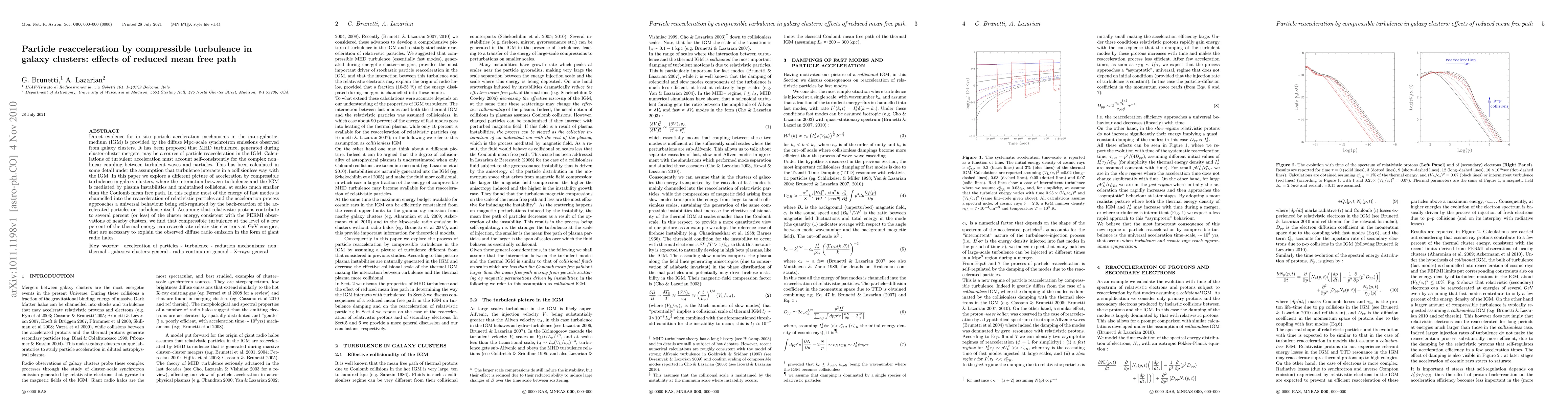 This paper investigates particle reacceleration in galaxy clusters via compressible turbulence, proposing that plasma instabilities and collisional interactions at scales smaller than the Coulomb mean free path drive this process. It finds that turbulence at a few percent of thermal energy can reaccelerate relativistic electrons to GeV energies, explaining the observed diffuse radio emissions in giant radio halos.
