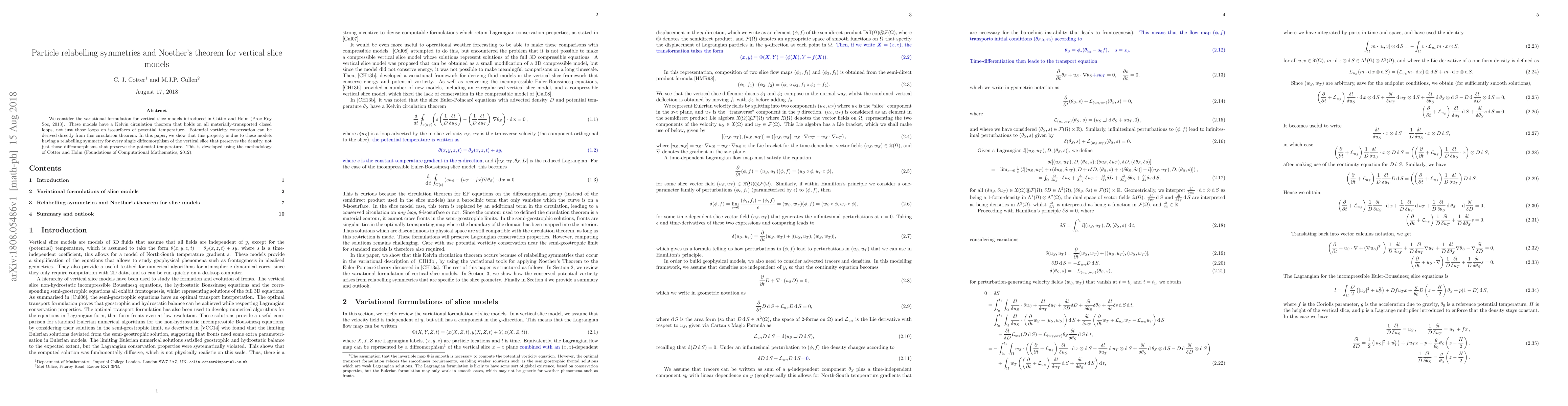 Vertical slice models have a hidden symmetry that preserves density under certain transformations, leading to vorticity conservation. This discovery extends previous results, showing the model's Kelvin circulation theorem is a direct consequence of this relabelling symmetry.