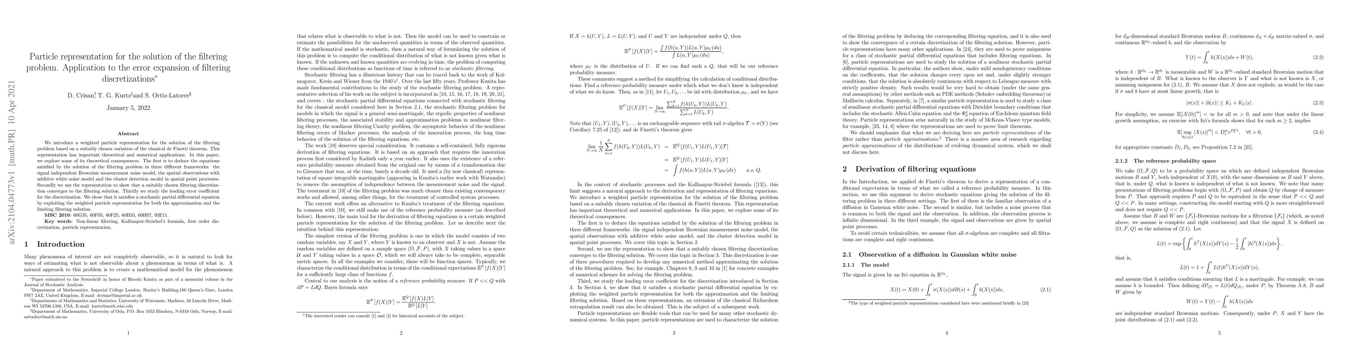 We introduce a weighted particle representation for the solution of the filtering problem based on a suitably chosen variation of the classical de Finetti theorem. This representation has important theoretical and numerical applications. In this paper, we explore some of its theoretical consequences. The first is to deduce the equations satisfied by the solution of the filtering problem in three different frameworks: the signal independent Brownian measurement noise model, the spatial observations with additive white noise model and the cluster detection model in spatial point processes. Secondly we use the representation to show that a suitably chosen filtering discretisation converges to the filtering solution. Thirdly we study the leading error coefficient for the discretisation. We show that it satisfies a stochastic partial differential equation by exploiting the weighted particle representation for both the approximation and the limiting filtering solution.