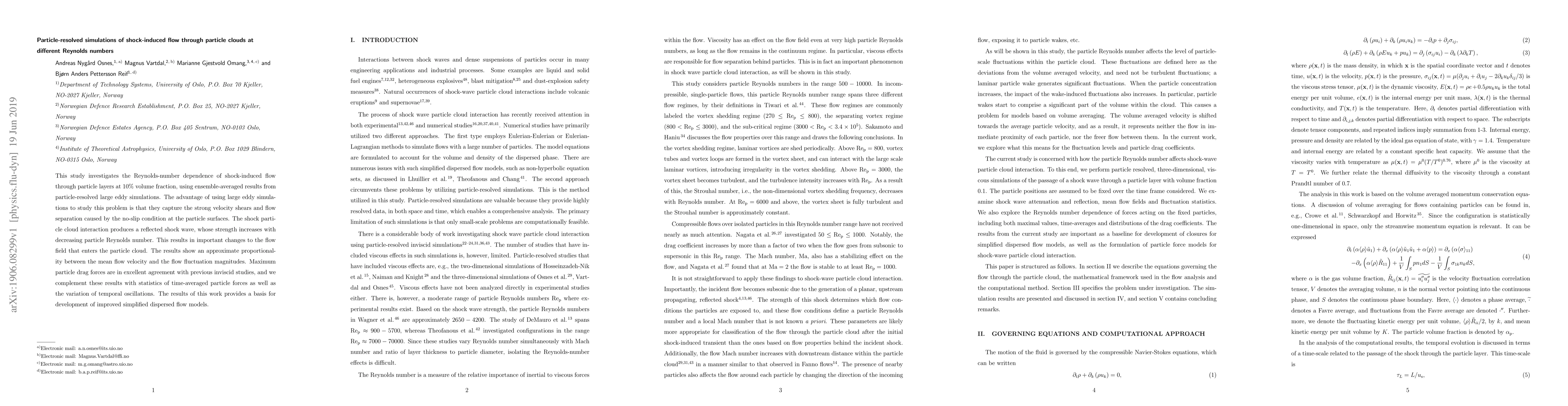 This study investigates the Reynolds-number dependence of shock-induced flow through particle layers at 10\% volume fraction, using ensemble-averaged results from particle-resolved large eddy simulations. The advantage of using large eddy simulations to study this problem is that they capture the strong velocity shears and flow separation caused by the no-slip condition at the particle surfaces. The shock particle cloud interaction produces a reflected shock wave, whose strength increases with decreasing particle Reynolds number. This results in important changes to the flow field that enters the particle cloud. The results show an approximate proportionality between the mean flow velocity and the flow fluctuation magnitudes. Maximum particle drag forces are in excellent agreement with previous inviscid studies, and we complement these results with statistics of time-averaged particle forces as well as the variation of temporal oscillations. The results of this work provides a basis for development of improved simplified dispersed flow models.
