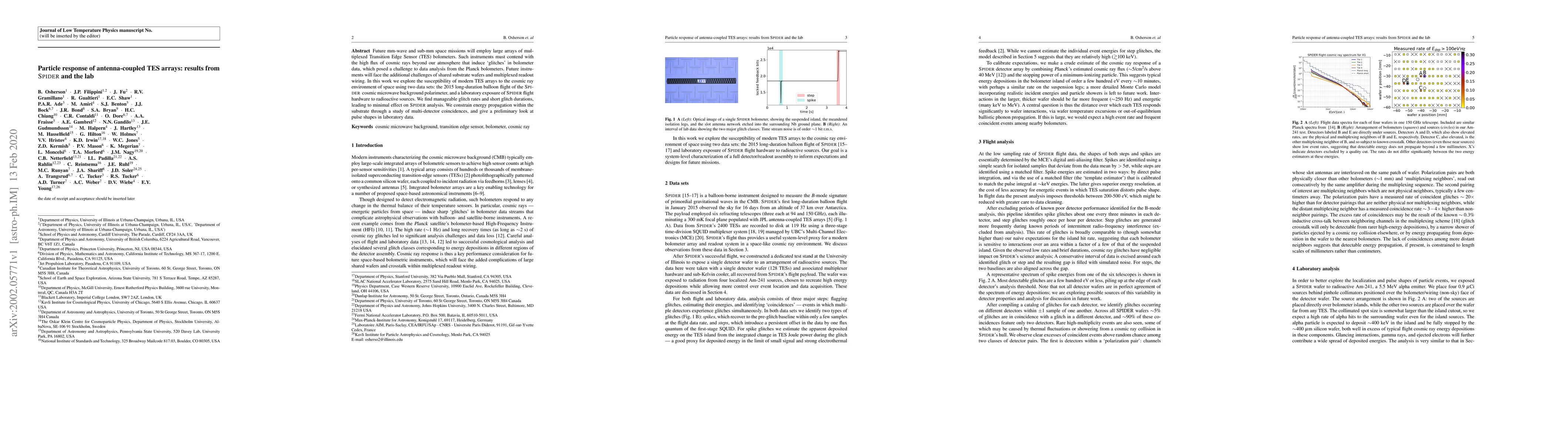 This paper investigates the particle response of antenna-coupled Transition Edge Sensor (TES) arrays using SPIDER data from a 2015 balloon flight and lab tests. It finds manageable glitch rates and short glitch durations, indicating minimal impact on data analysis, and provides insights into energy propagation within the substrate.