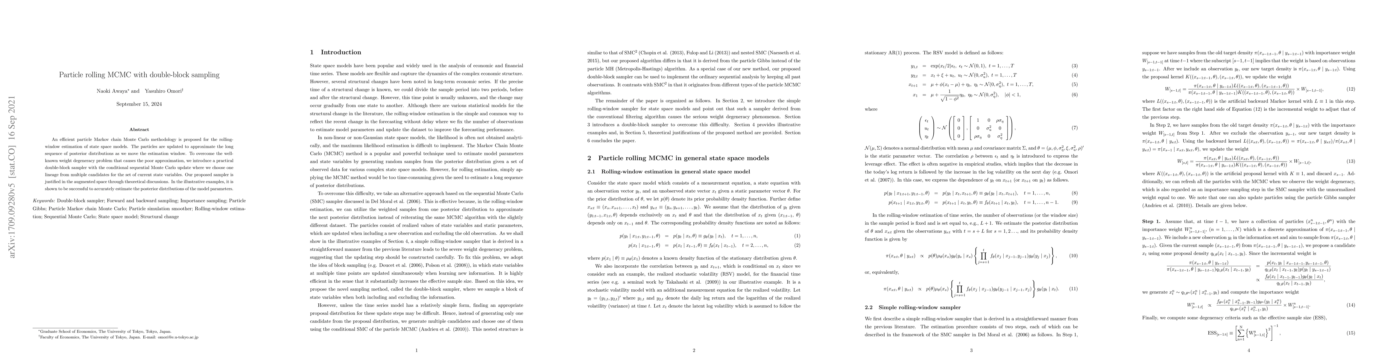 An efficient simulation-based methodology is proposed for the rolling window estimation of state space models, called particle rolling Markov chain Monte Carlo (MCMC) with double block sampling. In our method, which is based on Sequential Monte Carlo (SMC), particles are sequentially updated to approximate the posterior distribution for each window by learning new information and discarding old information from observations. Th particles are refreshed with an MCMC algorithm when the importance weights degenerate. To avoid degeneracy, which is crucial for reducing the computation time, we introduce a block sampling scheme and generate multiple candidates by the algorithm based on the conditional SMC. The theoretical discussion shows that the proposed methodology with a nested structure is expressed as SMC sampling for the augmented space to provide the justification. The computational performance is evaluated in illustrative examples, showing that the posterior distributions of the model parameters are accurately estimated. The proofs and additional discussions (algorithms and experimental results) are provided in the Supplementary Material.