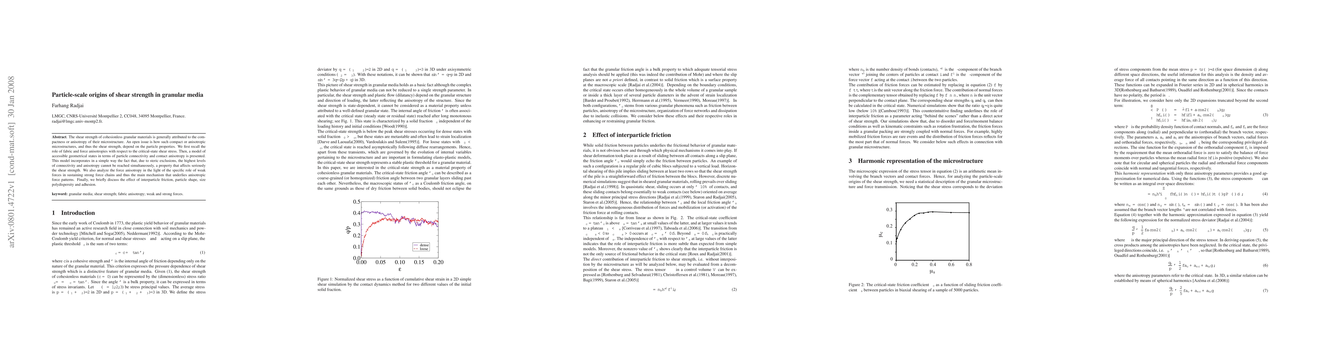 The shear strength of cohesionless granular materials is generally attributed to the compactness or anisotropy of their microstructure. An open issue is how such compact or anisotropic microstructures, and thus the shear strength, depend on the particle properties. We first recall the role of fabric and force anisotropies with respect to the critical-state shear stress. Then, a model of accessible geometrical states in terms of particle connectivity and contact anisotropy is presented. This model incorporates in a simple way the fact that, due to steric exclusions, the highest levels of connectivity and anisotropy cannot be reached simultaneously, a property that affects seriously the shear strength. We also analyze the force anisotropy in the light of the specific role of weak forces in sustaining strong force chains and thus the main mechanism that underlies anisotropic force patterns. Finally, we briefly discuss the effect of interparticle friction, particle shape, size polydispersity and adhesion.