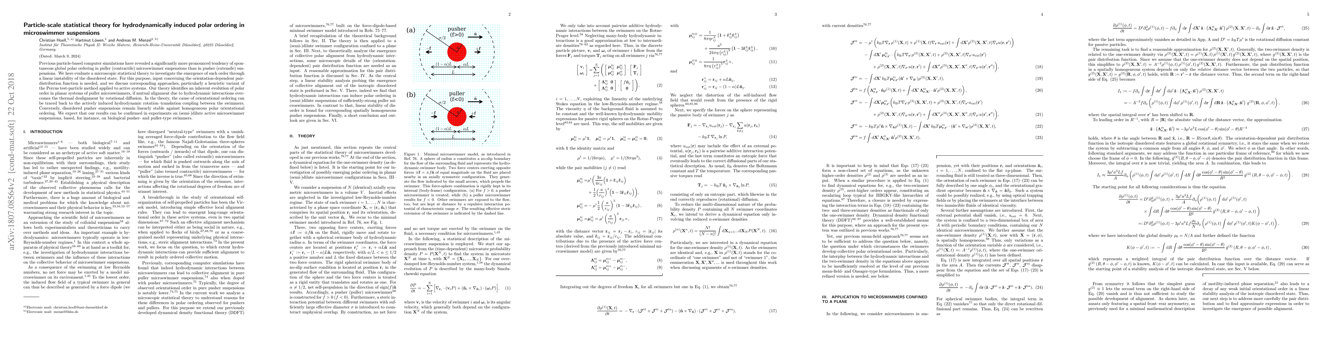 This paper develops a statistical theory to explain the emergence of polar ordering in suspensions of contractile (puller) microswimmers, showing a tendency for spontaneous global order due to hydrodynamic interactions, while pusher suspensions remain disordered. The theory identifies the active-induced hydrodynamic coupling as a key factor in this orientational ordering.
