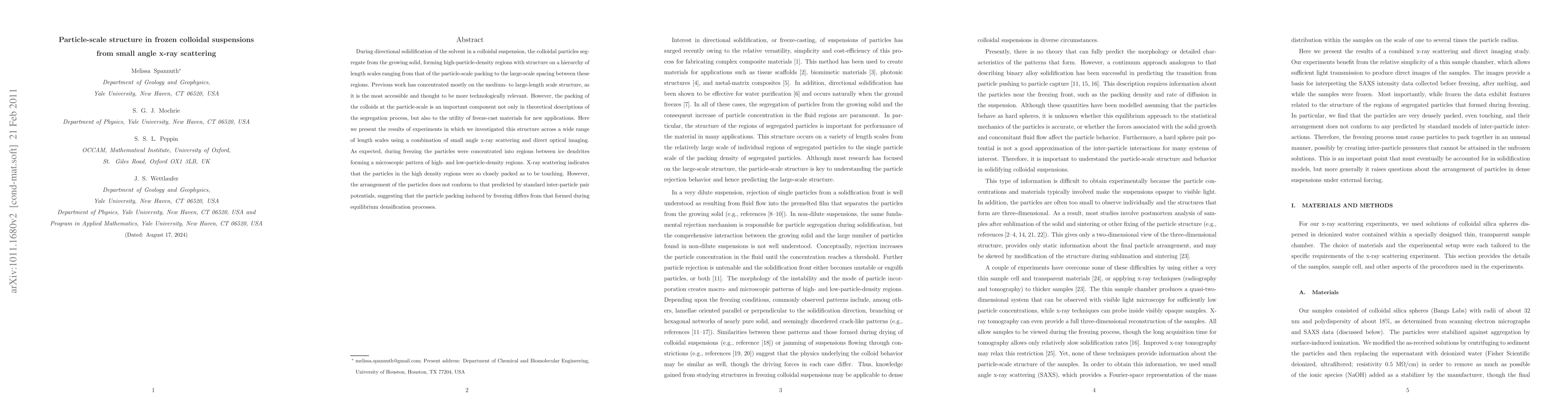 This study uses small angle x-ray scattering and optical imaging to investigate the particle-scale structure in frozen colloidal suspensions during directional solidification, revealing closely packed, touching particles that do not conform to standard inter-particle potential predictions, indicating a unique freezing-induced packing.