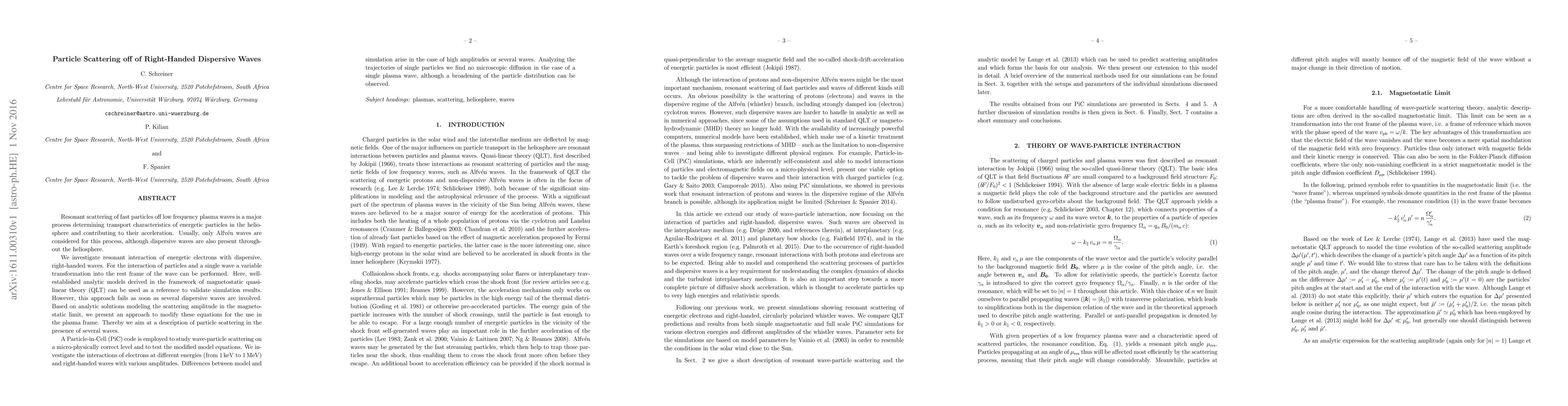 This paper investigates the resonant scattering of energetic electrons off right-handed dispersive waves in the heliosphere, modifying magnetostatic quasi-linear theory to account for multiple waves. A Particle-in-Cell code validates the modified model, showing no microscopic diffusion but distribution broadening for single waves, with discrepancies arising at high amplitudes or multiple wave interactions.