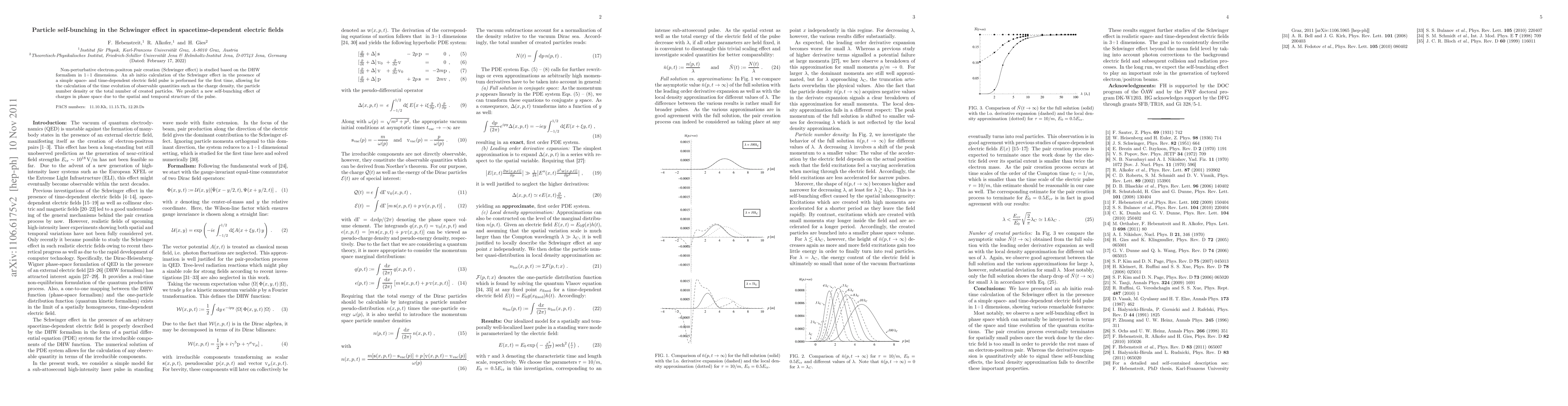 Non-perturbative electron-positron pair creation (Schwinger effect) is studied based on the equal-time Wigner formalism in 1+1 dimensions. An ab initio calculation of the Schwinger effect in the presence of a simple space- and time-dependent electric field pulse is performed for the first time, allowing for the calculation of the time evolution of observable quantities such as the charge density, the particle number density or the total number of created particles. We predict a new self-bunching effect of charges in phase space due to the spatial and temporal structure of the pulse.