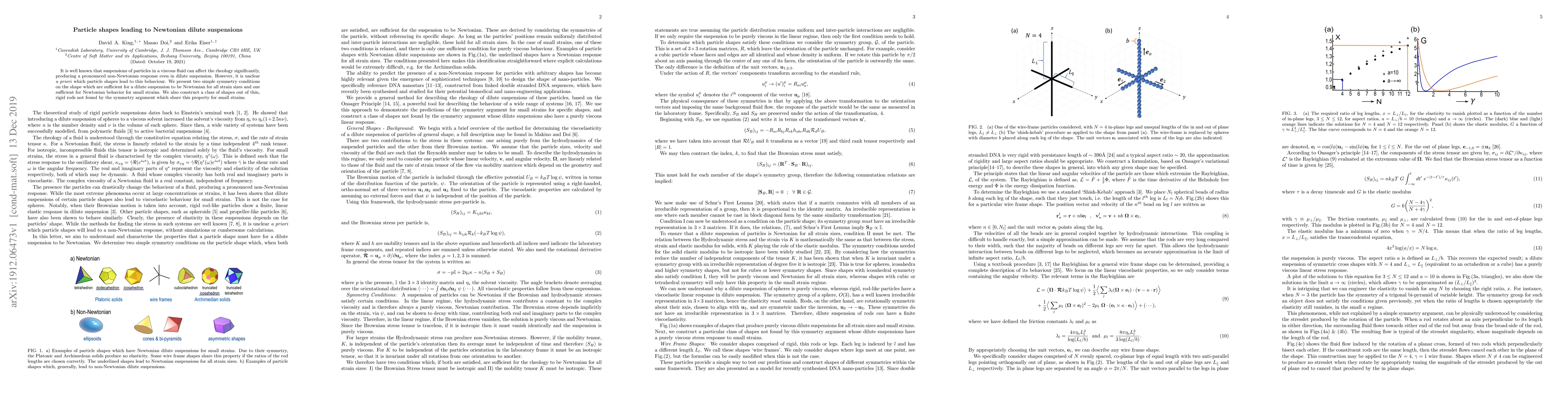 This paper identifies simple symmetry conditions that ensure Newtonian behavior in dilute suspensions of particles in a viscous fluid, even for large strains. It also presents a class of rod-like shapes that exhibit Newtonian behavior for small strains, extending beyond the symmetry conditions.