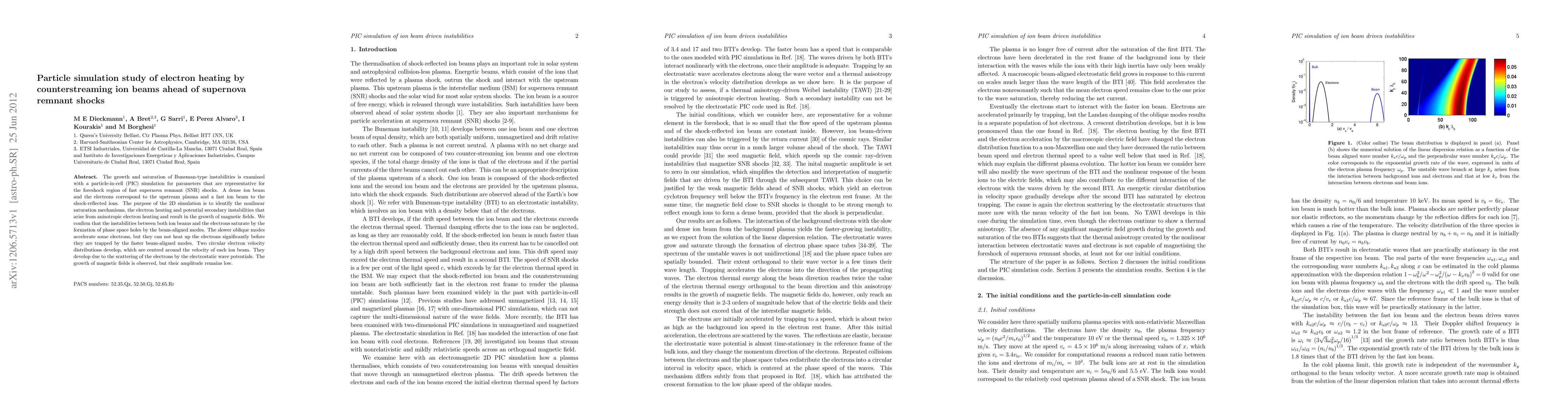 This study uses particle-in-cell simulations to investigate electron heating by counterstreaming ion beams in the foreshock region of supernova remnant shocks, identifying nonlinear saturation mechanisms and secondary instabilities. The simulation reveals that beam-aligned modes dominate electron heating, while oblique modes contribute minimally, resulting in low-amplitude magnetic field growth.