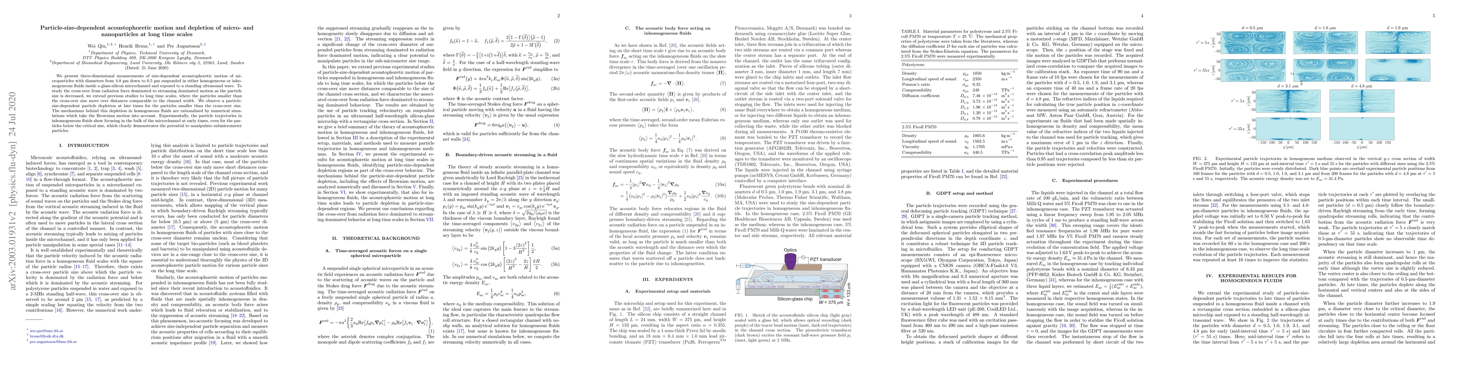 We present three-dimensional measurements of size-dependent acoustophoretic motion of microparticles with diameters from 4.8 um down to 0.5 um suspended in either homogeneous or inhomogeneous fluids inside a glass-silicon microchannel and exposed to a standing ultrasound wave. To study the cross-over from radiation force dominated to streaming dominated motion as the particle size is decreased, we extend previous studies to long time scales, where the particles smaller than the cross-over size move over distances comparable to the channel width. We observe a particle-size-dependent particle depletion at late times for the particles smaller than the cross-over size. The mechanisms behind this depletion in homogeneous fluids are rationalized by numerical simulations which take the Brownian motion into account. Experimentally, the particle trajectories in inhomogeneous fluids show focusing in the bulk of the microchannel at early times, even for the particles below the critical size, which clearly demonstrates the potential to manipulate submicrometer particles.
