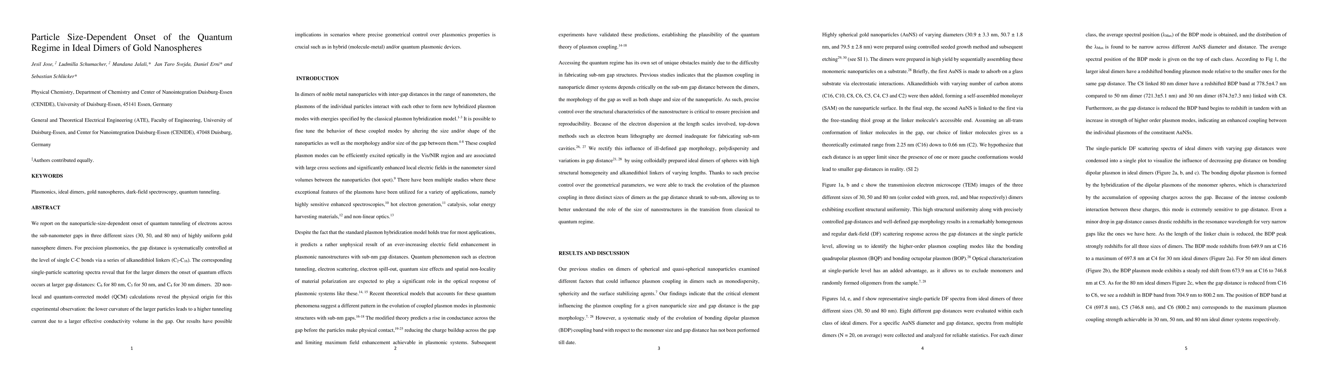 This paper investigates the quantum tunneling behavior in gold nanosphere dimers of varying sizes (30, 50, and 80 nm) with controlled gap distances using alkanedithiol linkers. The study finds that larger dimers exhibit quantum effects at greater gap distances due to lower curvature and higher effective conductivity volume, with implications for precision plasmonics and quantum plasmonic devices.