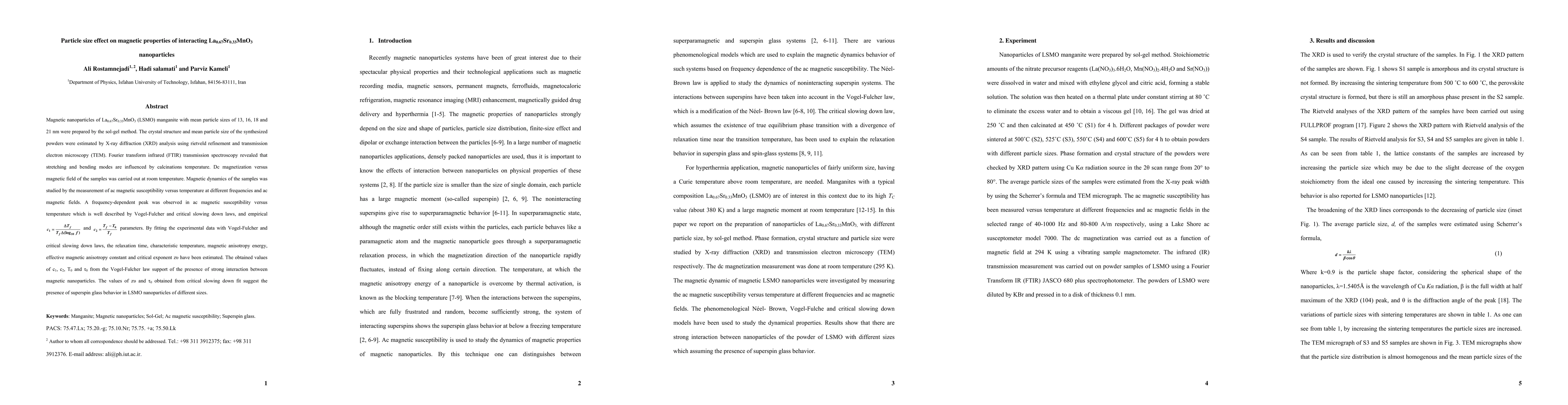 Magnetic nanoparticles of La0.67Sr0.33MnO3 (LSMO) manganite with mean particle sizes of 13, 16, 18 and 21 nm were prepared by the sol-gel method. The crystal structure and mean particle size of the synthesized powders were estimated by X-ray diffraction (XRD) analysis using rietveld refinement and transmission electron microscopy (TEM). Fourier transform infrared (FTIR) transmission spectroscopy revealed that stretching and bending modes are influenced by calcinations temperature. Dc magnetization versus magnetic field of the samples was carried out at room temperature. Magnetic dynamics of the samples was studied by the measurement of ac magnetic susceptibility versus temperature at different frequencies and ac magnetic fields. A frequency-dependent peak was observed in ac magnetic susceptibility versus temperature which is well described by Vogel-Fulcher and critical slowing down laws, and empirical and parameters. By fitting the experimental data with Vogel-Fulcher and critical slowing down laws, the relaxation time, characteristic temperature, magnetic anisotropy energy, effective magnetic anisotropy constant and critical exponent zv have been estimated. The obtained values of c1, c2, T0 and t0 from the Vogel-Fulcher law support of the presence of strong interaction between magnetic nanoparticles. The values of zv and t0 obtained from critical slowing down fit suggest the presence of superspin glass behavior in LSMO nanoparticles of different sizes.