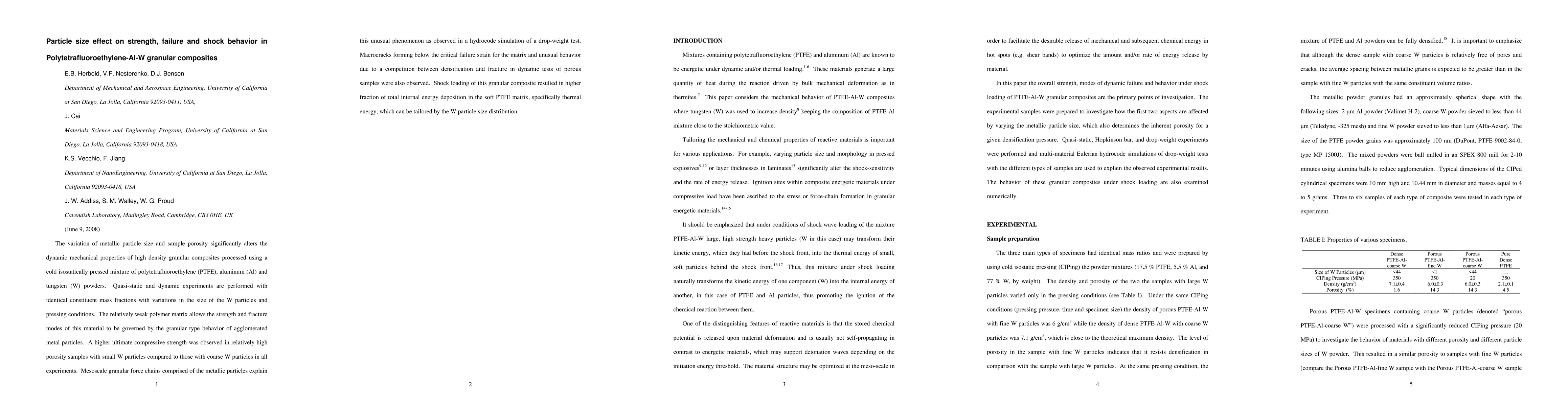 This study investigates how varying tungsten particle size and sample porosity affect the dynamic mechanical properties of PTFE-Al-W granular composites, finding higher ultimate compressive strength in high porosity samples with smaller W particles. The strength and failure behavior are dominated by the granular metallic particle interactions, with shock loading showing higher thermal energy deposition in the PTFE matrix influenced by the W particle size distribution.