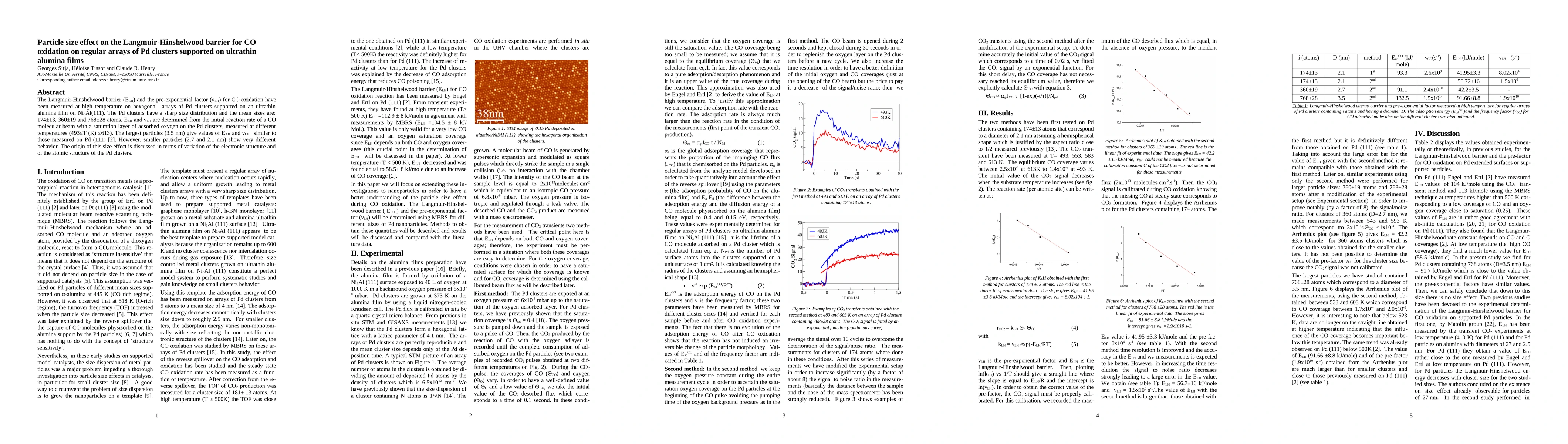 The Langmuir-Hinshelwood barrier (ELH) and the pre-exponential factor ($\nu$LH) for CO oxidation have been measured at high temperature on hexagonal arrays of Pd clusters supported on an ultrathin alumina film on Ni3Al(111). The Pd clusters have a sharp size distribution and the mean sizes are: 174$\pm$13, 360$\pm$19 and 768$\pm$28 atoms. ELH and $\nu$LH are determined from the initial reaction rate of a CO molecular beam with a saturation layer of adsorbed oxygen on the Pd clusters, measured at different temperatures (493$\le$T (K) $\le$613). The largest particles (3.5 nm) give values of ELH and $\nu$LH similar to those measured on Pd (111) [2]. However, smaller particles (2.7 and 2.1 nm) show very different behavior. The origin of this size effect is discussed in terms of variation of the electronic structure and of the atomic structure of the Pd clusters.