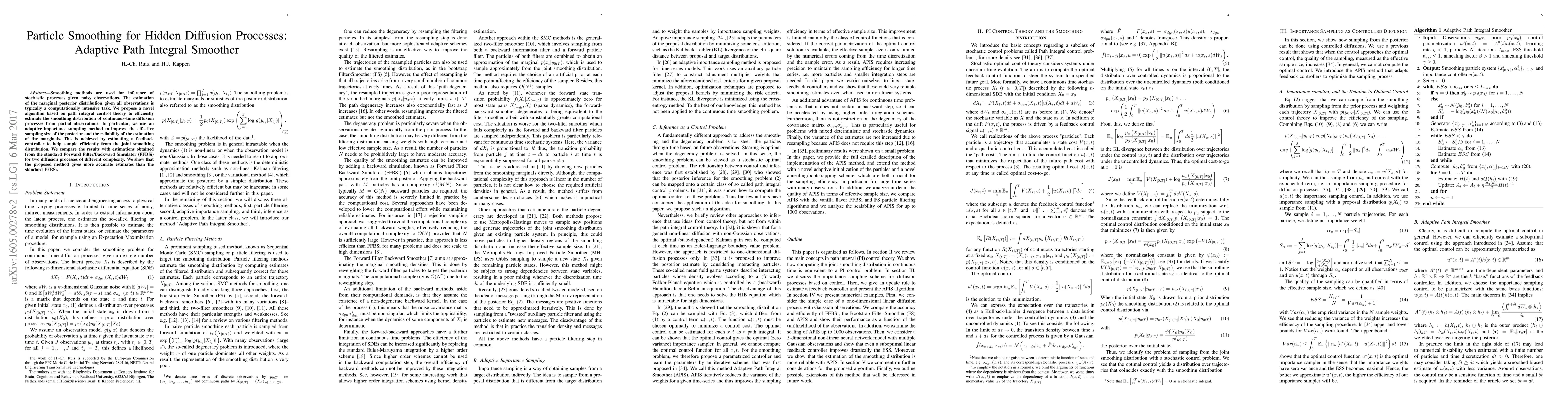 This paper proposes a particle smoothing algorithm for hidden diffusion processes using adaptive path integral control theory, which employs an adaptive importance sampling method to improve estimation accuracy. The method is shown to provide more reliable results than the standard Forward Filter/Backward Simulator, especially when the smoothing distribution diverges from the filter distribution.