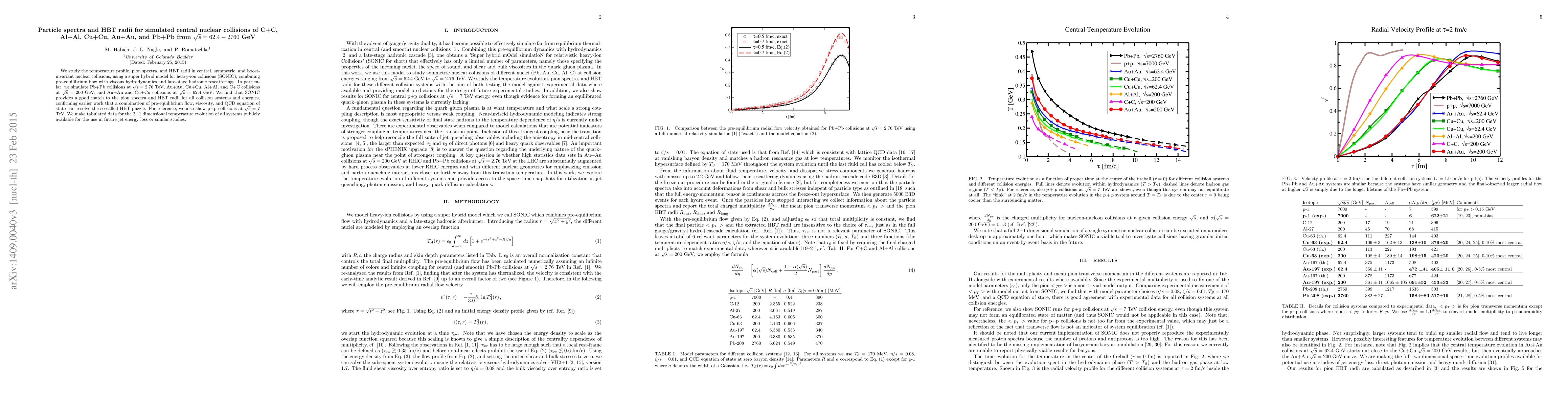 We study the temperature profile, pion spectra and HBT radii in central symmetric and boost-invariant nuclear collisions using a super hybrid model for heavy-ion collisions (SONIC) combining pre-equilibrium flow with viscous hydrodynamics and late-stage hadronic rescatterings. In particular, we simulate Pb+Pb collisions at Sqrt(s)=2.76 TeV, Au+Au, Cu+Cu, Al+Al, and C+C collisions at Sqrt(s)=200 GeV and Au+Au, Cu+Cu collisions at Sqrt(s)=62.4 GeV. We find that SONIC provides a good match to the pion spectra and HBT radii for all collision systems and energies, confirming earlier work that a combination of pre-equilibrium flow, viscosity and QCD equation of state can resolve the so-called HBT puzzle. For reference, we also show p+p collisions at Sqrt(s)=7 TeV. We make tabulated data for the 2+1 dimensional temperature evolution of all systems publicly available for the use in future jet energy loss or similar studies.