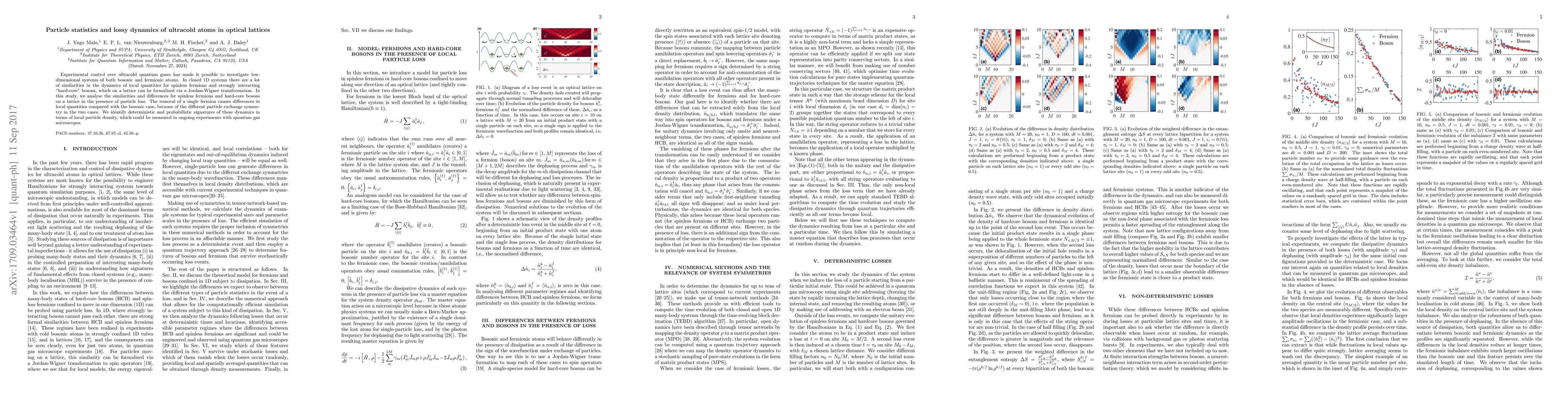 Experimental control over ultracold quantum gases has made it possible to investigate low-dimensional systems of both bosonic and fermionic atoms. In closed 1D systems there are a lot of similarities in the dynamics of local quantities for spinless fermions and strongly interacting "hard-core" bosons, which on a lattice can be formalised via a Jordan-Wigner transformation. In this study, we analyse the similarities and differences for spinless fermions and hard-core bosons on a lattice in the presence of particle loss. The removal of a single fermion causes differences in local quantities compared with the bosonic case, because of the different particle exchange symmetry in the two cases. We identify deterministic and probabilistic signatures of these dynamics in terms of local particle density, which could be measured in ongoing experiments with quantum gas microscopes.