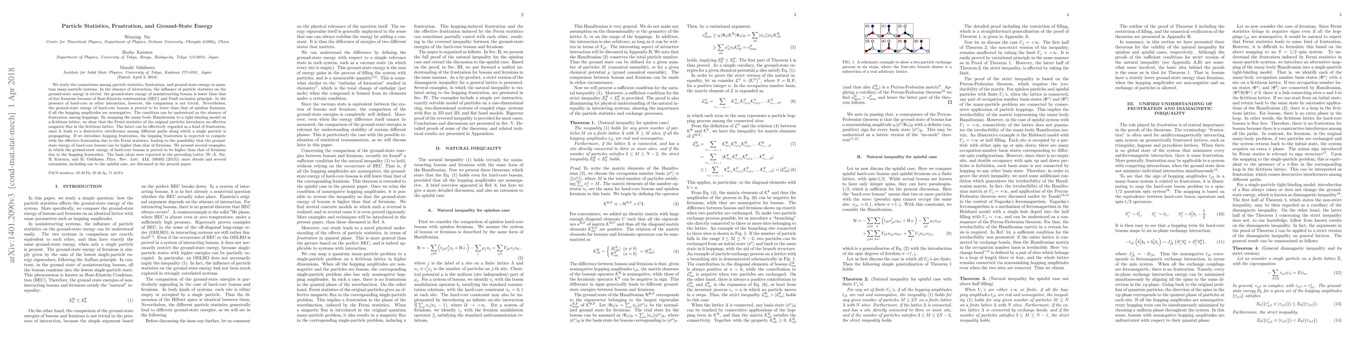 We study the connections among particle statistics, frustration, and ground-state energy in quantum many-particle systems. In the absence of interaction, the influence of particle statistics on the ground-state energy is trivial: the ground-state energy of noninteracting bosons is lower than that of free fermions because of Bose-Einstein condensation and Pauli exclusion principle. In the presence of hard-core or other interaction, however, the comparison is not trivial. Nevertheless, the ground-state energy of hard-core bosons is proved to be lower than that of spinless fermions, if all the hopping amplitudes are nonnegative. The condition can be understood as the absence of frustration among hoppings. By mapping the many-body Hamiltonian to a tight-binding model on a fictitious lattice, we show that the Fermi statistics of the original particles introduces an effective magnetic flux in the fictitious lattice. The latter can be regarded as a frustration, since it leads to a destructive interference among different paths along which a single particle is propagating. If we introduce hopping frustration, the hopping frustration is expected to compete with "effective frustration", leading to the possibility that the ground-state energy of hard-core bosons can be higher than that of fermions. We present several examples, in which the ground-state energy of hard-core bosons is proved to be higher than that of fermions due to the hopping frustration. The basic ideas were reported in a recent Letter [W.-X. Nie, H. Katsura, and M. Oshikawa, Phys. Rev. Lett. 111, 100402 (2013)]; more details and several extensions, including one to the spinful case, are discussed in the present paper.