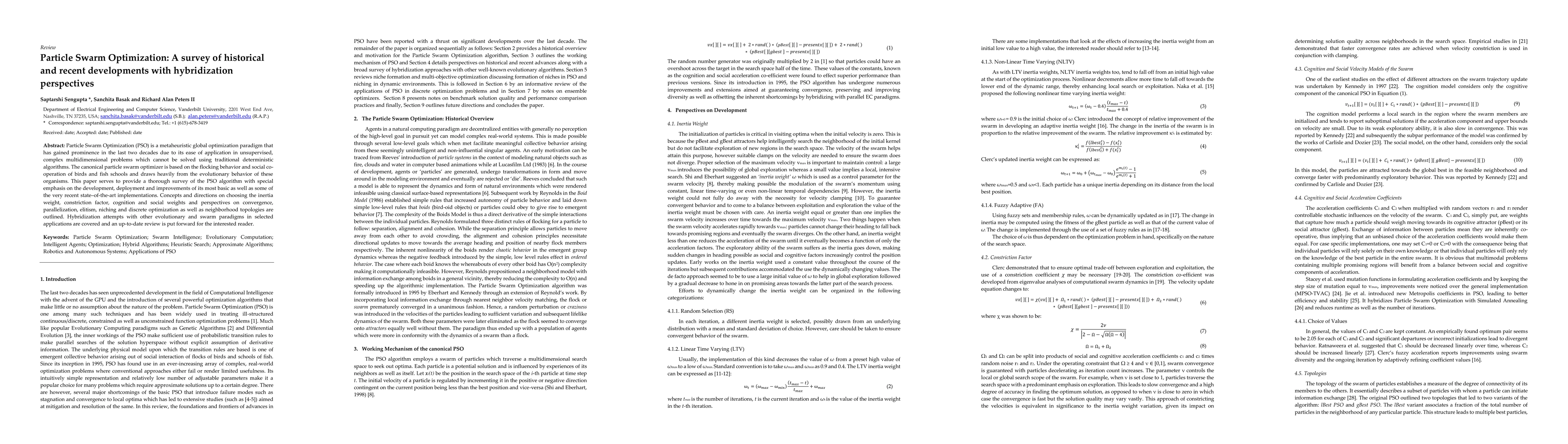 Particle Swarm Optimization (PSO) is a metaheuristic global optimization paradigm that has gained prominence in the last two decades due to its ease of application in unsupervised, complex multidimensional problems which cannot be solved using traditional deterministic algorithms. The canonical particle swarm optimizer is based on the flocking behavior and social co-operation of birds and fish schools and draws heavily from the evolutionary behavior of these organisms. This paper serves to provide a thorough survey of the PSO algorithm with special emphasis on the development, deployment and improvements of its most basic as well as some of the state-of-the-art implementations. Concepts and directions on choosing the inertia weight, constriction factor, cognition and social weights and perspectives on convergence, parallelization, elitism, niching and discrete optimization as well as neighborhood topologies are outlined. Hybridization attempts with other evolutionary and swarm paradigms in selected applications are covered and an up-to-date review is put forward for the interested reader.