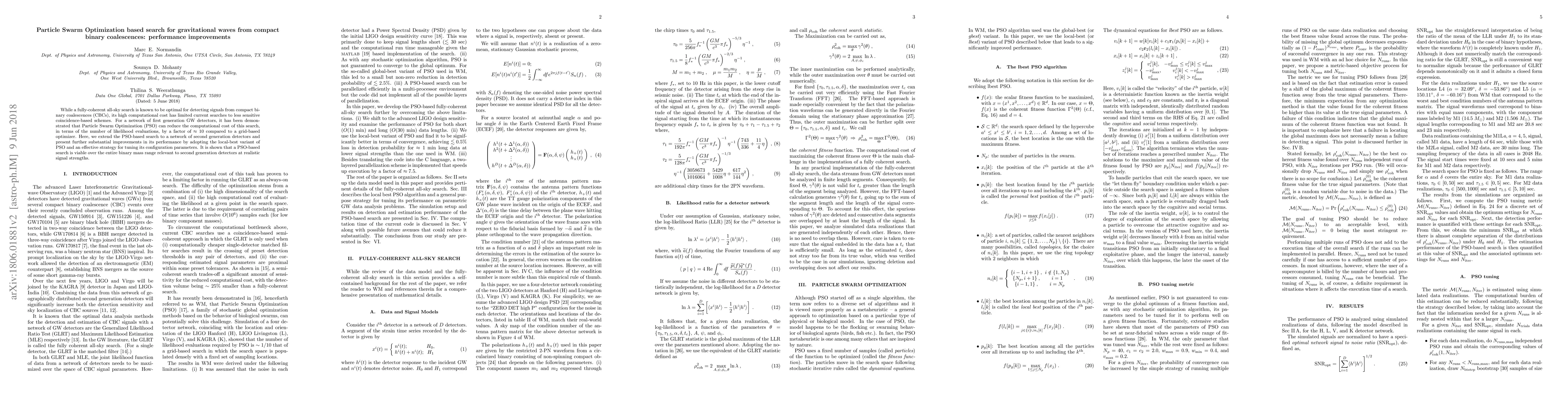 This paper explores the application of Particle Swarm Optimization (PSO) to enhance the search for gravitational waves from compact binary coalescences, demonstrating a tenfold reduction in computational cost compared to grid-based methods. The study further optimizes PSO for second-generation detectors, showing significant performance improvements and viability across relevant mass ranges.