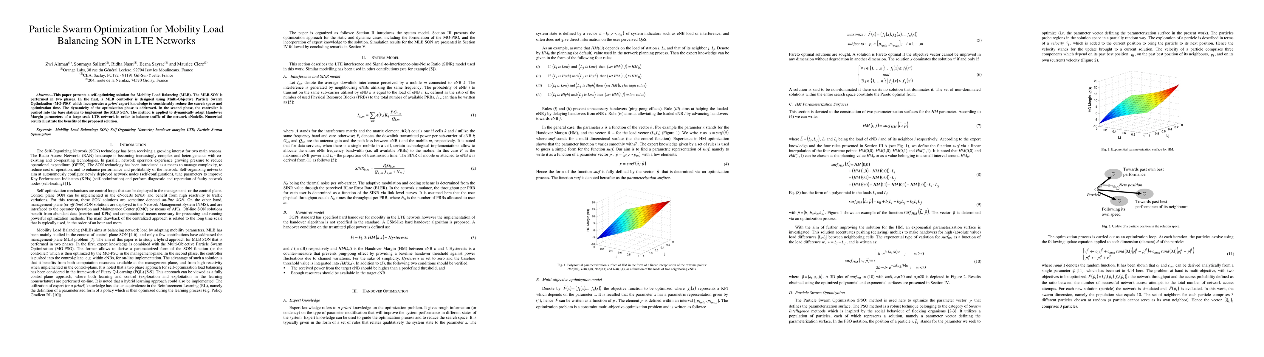 This work stands out by employing MO-PSO for parameterizing the HM control function, integrating expert knowledge, and demonstrating its effectiveness in a large-scale LTE network context.