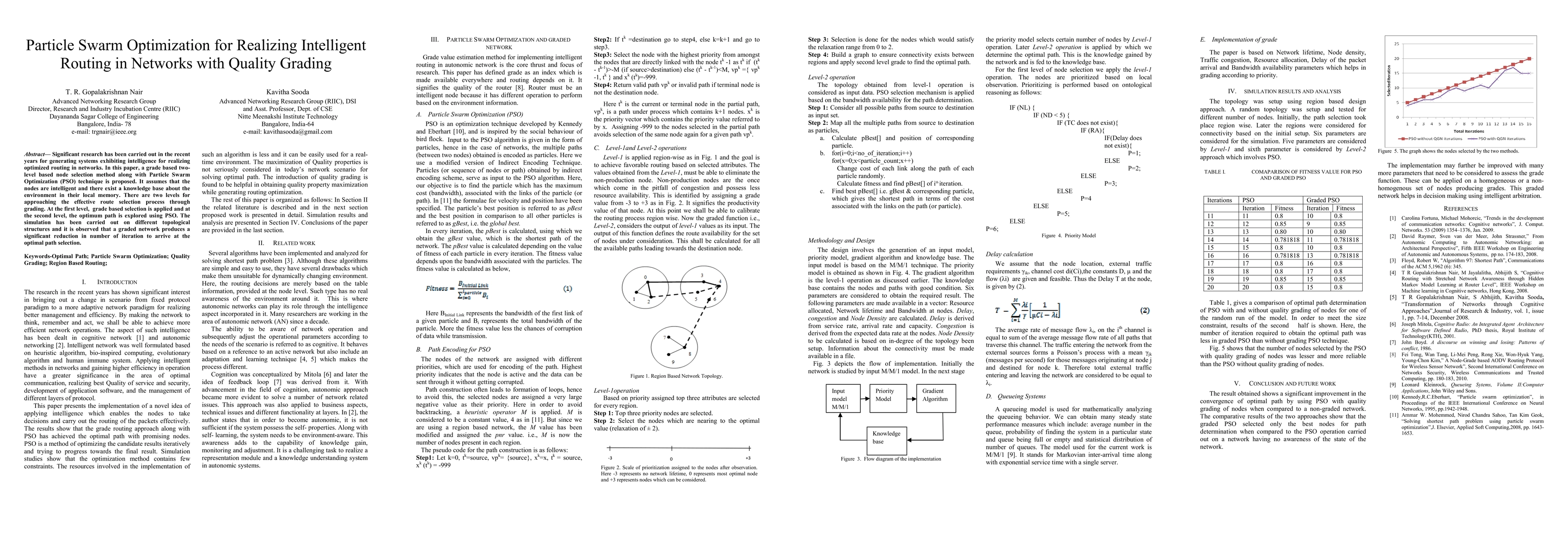 This paper proposes a two-level node selection method using Particle Swarm Optimization (PSO) for intelligent routing in networks. The method employs grade-based selection and PSO to find optimal paths, demonstrating significant reductions in iteration counts for optimal path selection across various network topologies.