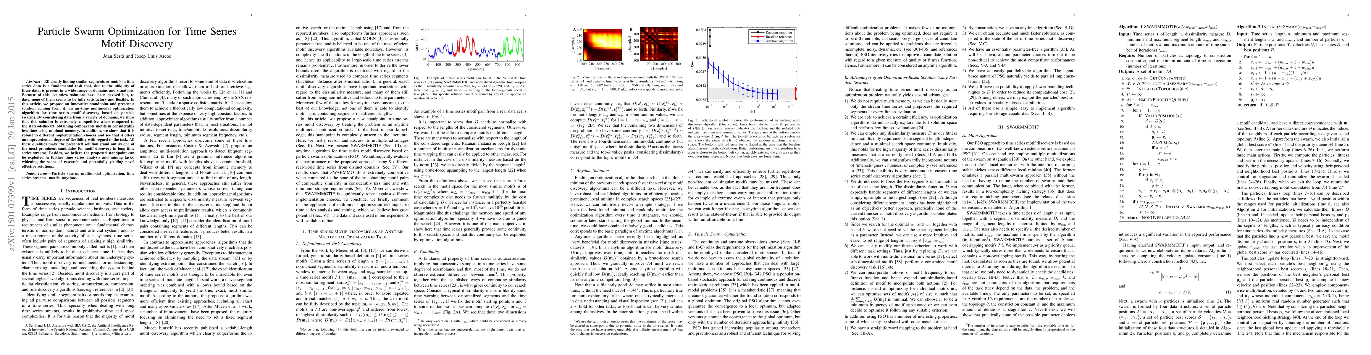 This paper proposes a particle swarm optimization algorithm for discovering time series motifs, demonstrating its competitiveness, efficiency, and flexibility compared to existing methods. The approach shows robustness and potential for broader applications in time series data analysis.