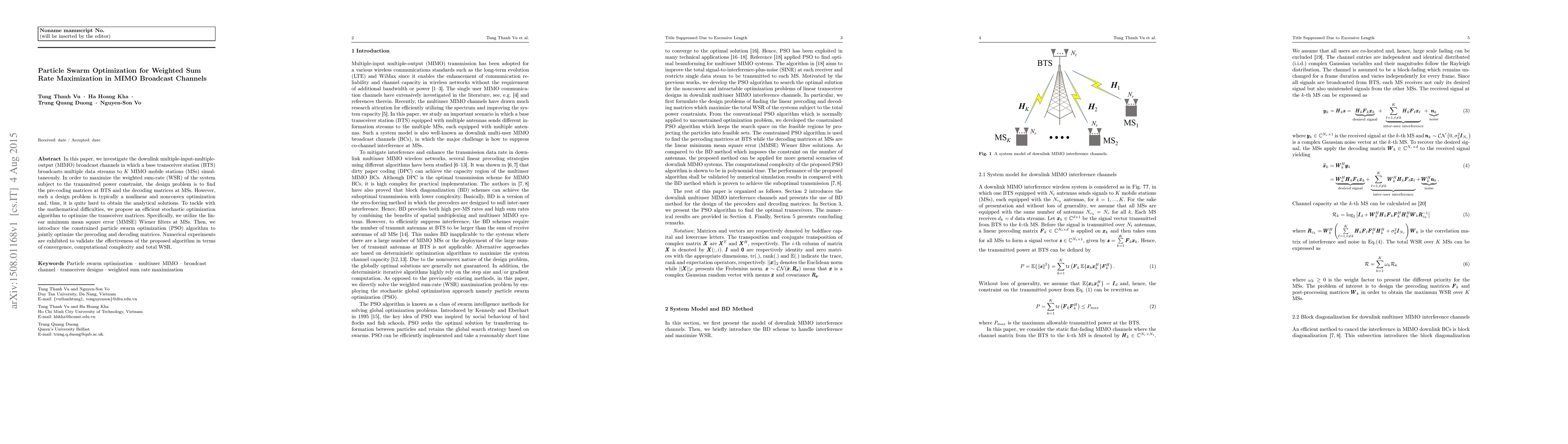 This paper proposes a constrained particle swarm optimization (PSO) algorithm to maximize the weighted sum-rate in MIMO broadcast channels. The method optimizes precoding and decoding matrices using linear MMSE Wiener filters, demonstrating improved convergence and efficiency in numerical experiments.