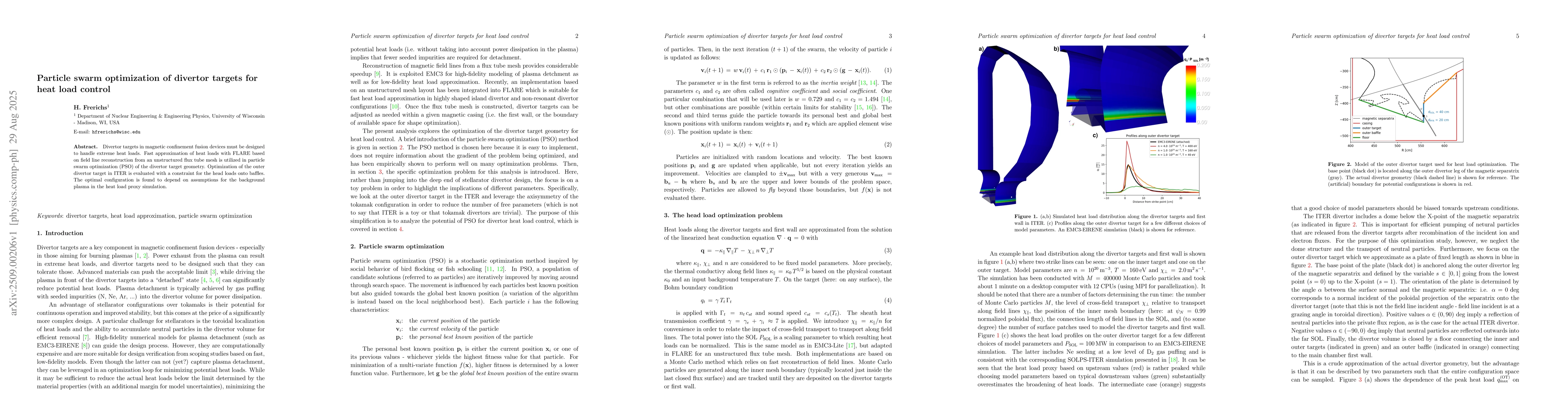 Divertor targets in magnetic confinement fusion devices must be designed to handle extreme heat loads. Fast approximation of heat loads with FLARE based on field line reconstruction from an unstructured flux tube mesh is utilized in particle swarm optimization (PSO) of the divertor target geometry. Optimization of the outer divertor target in ITER is evaluated with a constraint for the head loads onto baffles. The optimal configuration is found to depend on assumptions for the background plasma in the heat load proxy simulation.